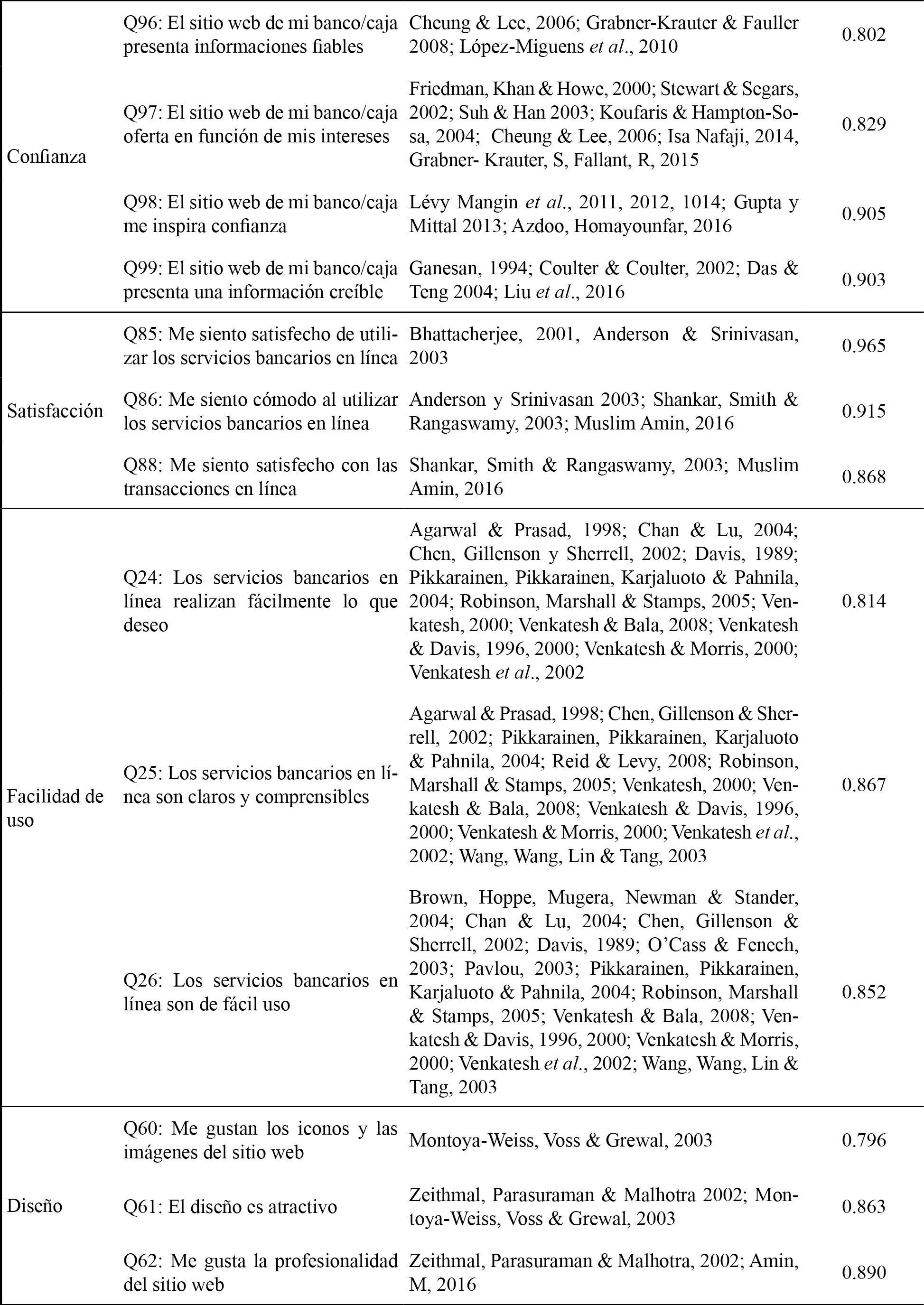 El modelo estructural de base sobre la confianza en línea para las instituciones bancarias se fundamenta en un análisis causal donde este constructo viene definido por la utilidad, seguridad y competencia de la entidad financiera. La confianza en línea sería el constructo anterior a la satisfacción del usuario, que a su vez vendría determinada por la facilidad de uso del sistema en línea y su diseño. La intención de uso de los servicios financieros online sería el constructo final del modelo (cuadro 6).