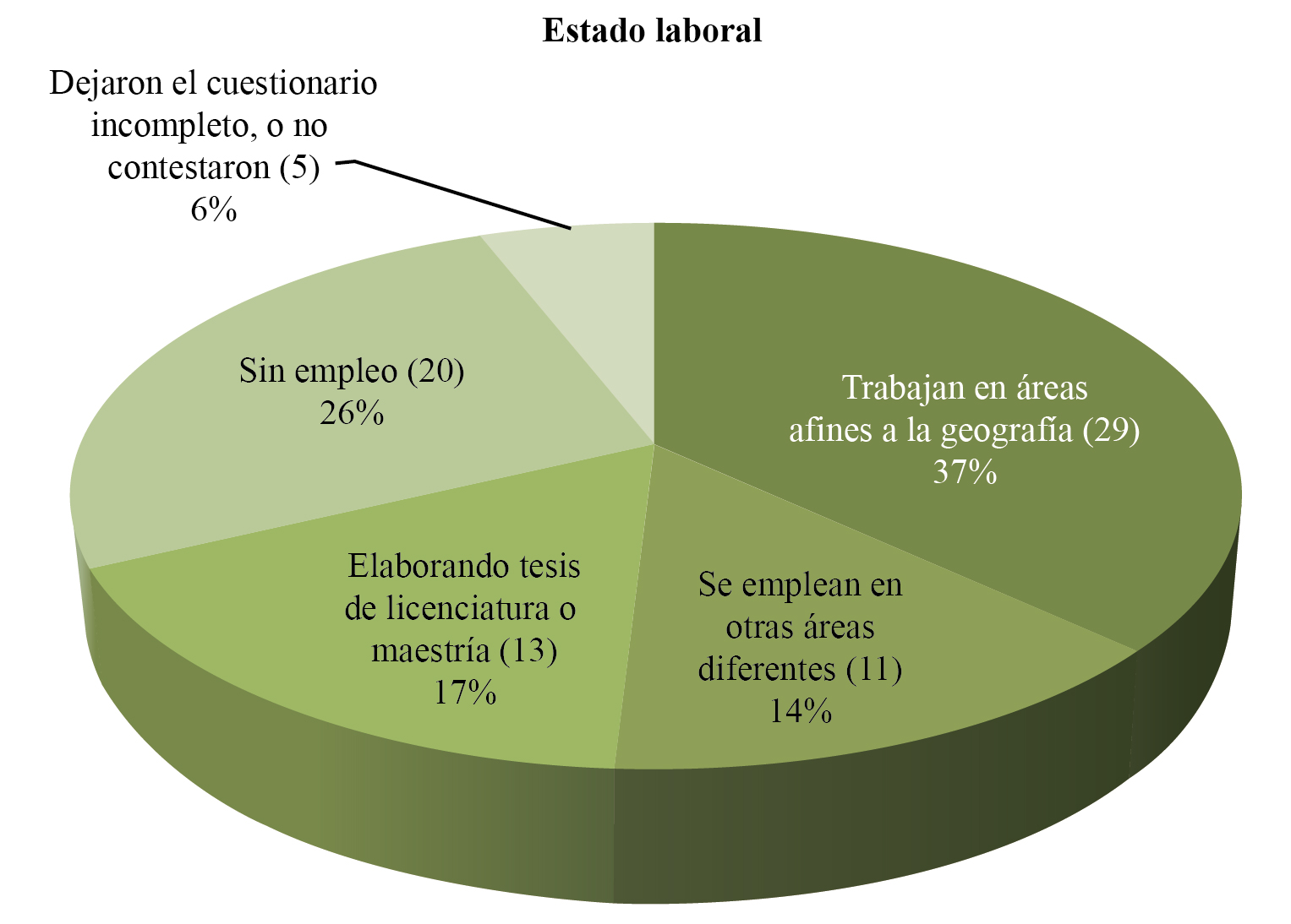 Como se confirmó, autores como Escamilla et al. (2015) mencionan que no se alcanzan a cubrir los puestos de trabajo para las nuevas generaciones, así como la presencia de desempleo de profesionistas en la Región Centro de México. En este artículo también se confirmó que casi la tercera parte de los egresados de geografía encuestados (26%) se encontraba en situación de desempleo.