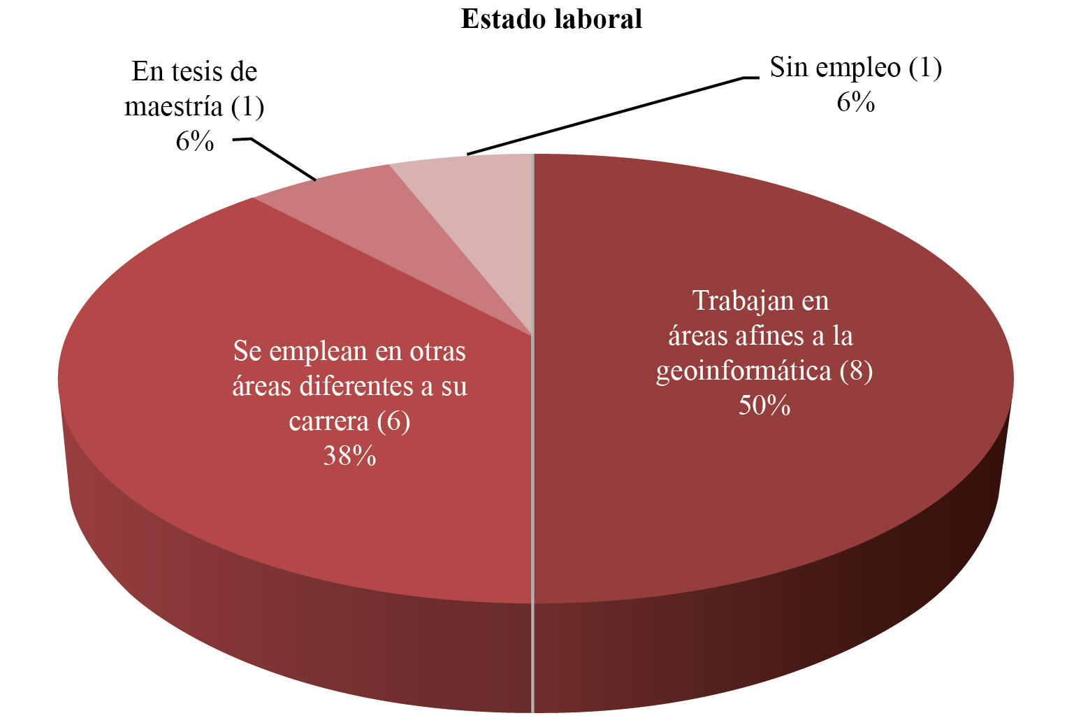 Para el caso de la Licenciatura en Geoinformática de la Universidad Autónoma de Ciudad Juárez, contestó la encuesta un total de 16 egresados (100%). De ellos, 50% (8 casos) trabajaba en áreas afines a la geoinformática, 38% (6 casos) manifestó laborar en otros rubros diferentes, 6% (1 alumno) mencionó estar desempleado y otro 6% (1 caso) declaró dedicarse de tiempo completo a la tesis de maestría (gráfica 2).