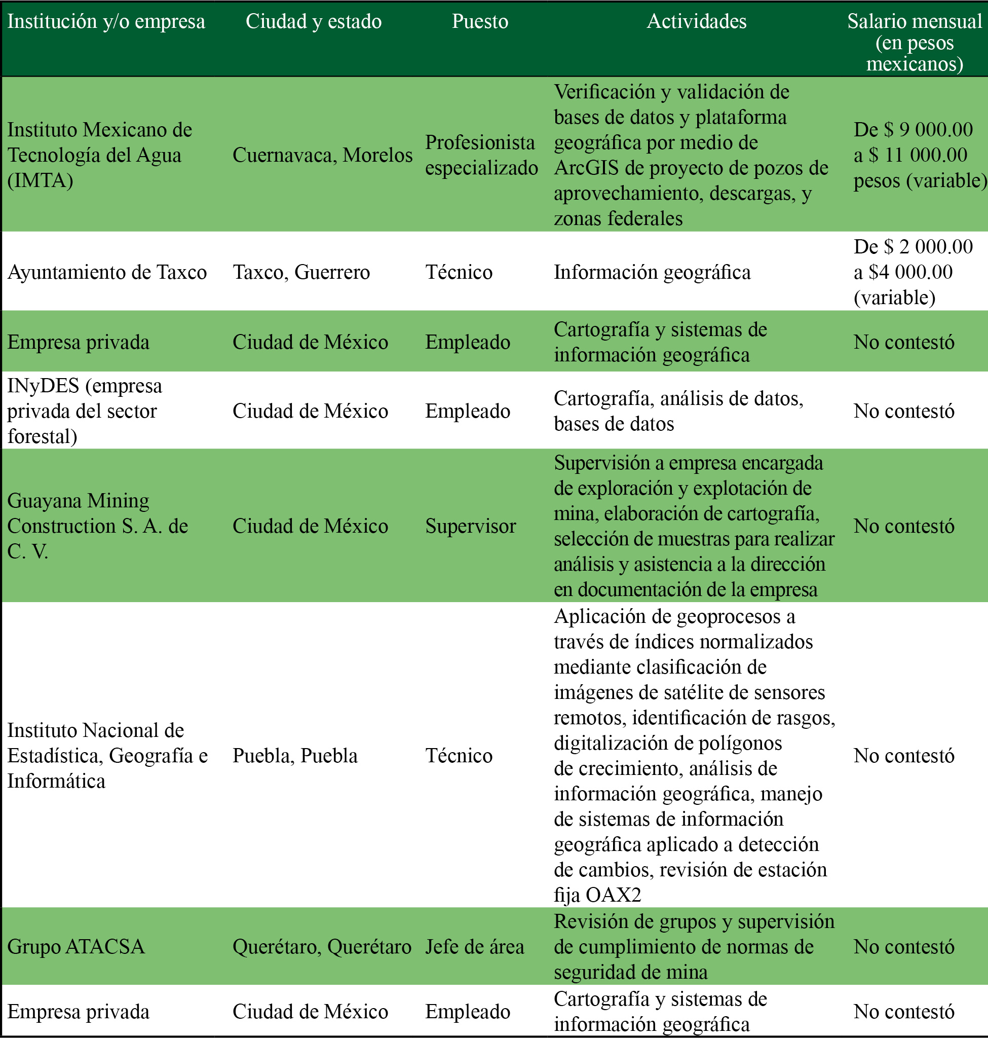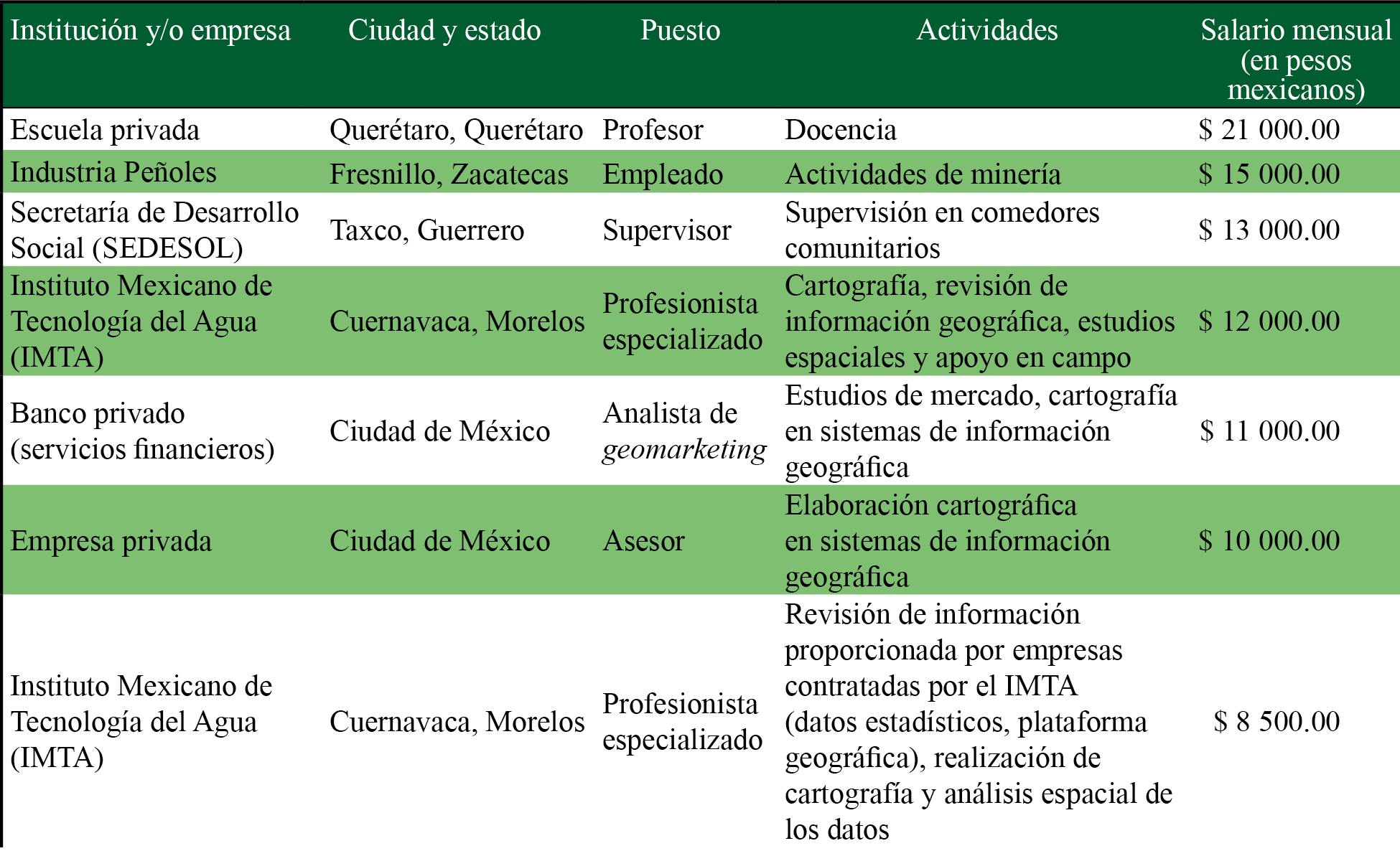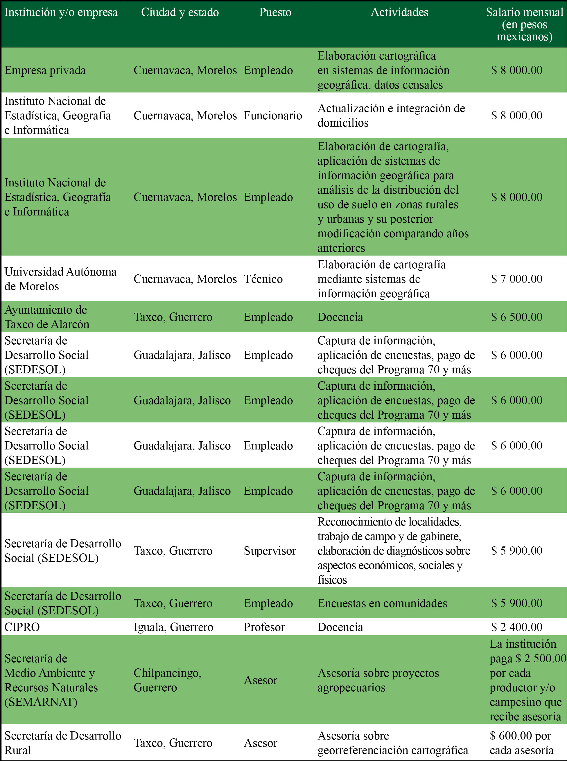 Sobre los egresados que trabajaban en ocupaciones diferentes a la geografía, los salarios estuvieron desde $6 000.00 pesos mensuales hasta $600.00 pesos mensuales (tabla 1), aquí la mayoría se encontraban en las ciudades de Iguala y Taxco (Guerrero), Yecaplixtla (Morelos) y Querétaro (Querétaro).