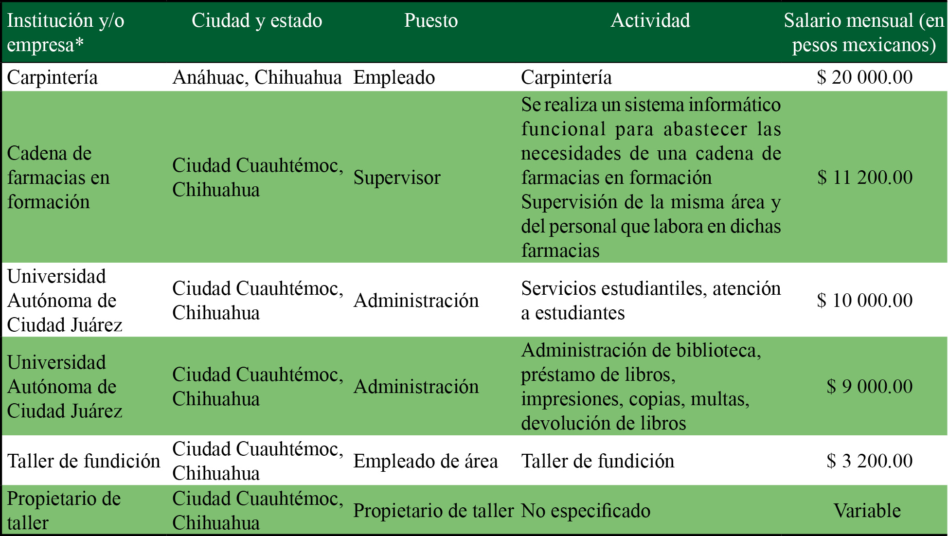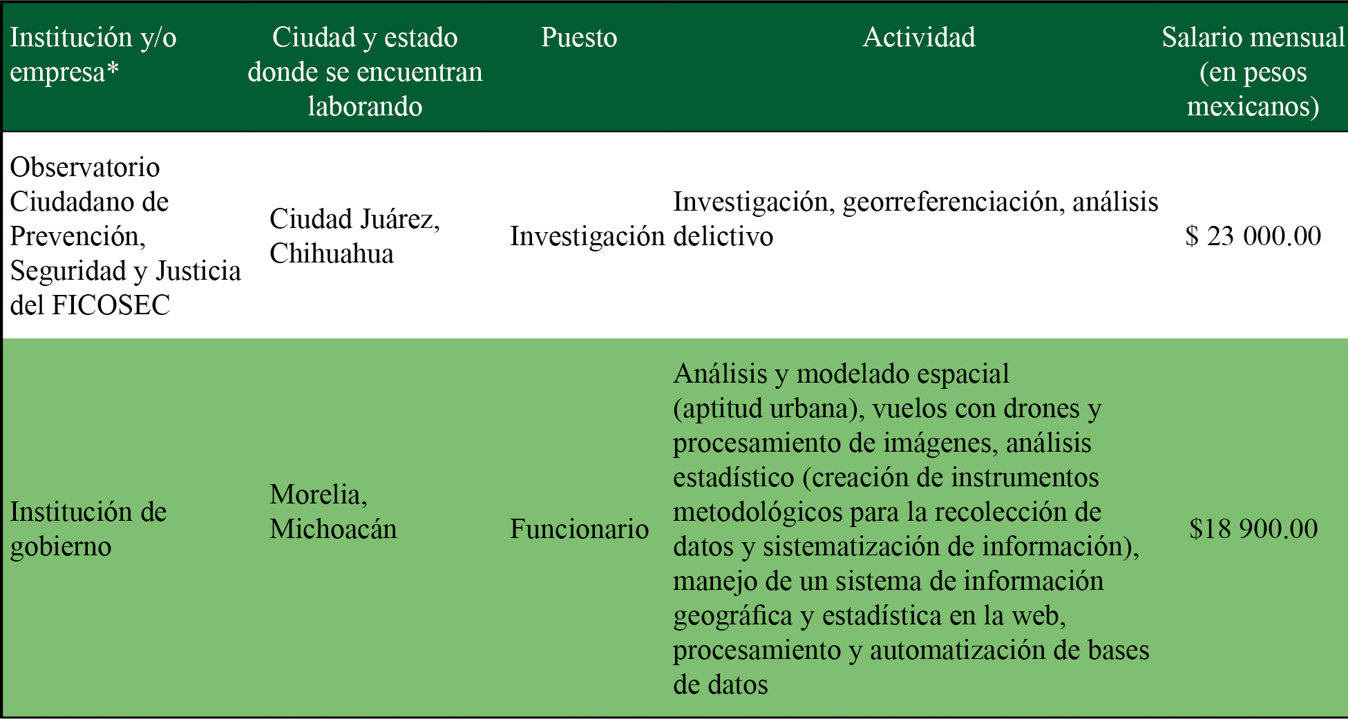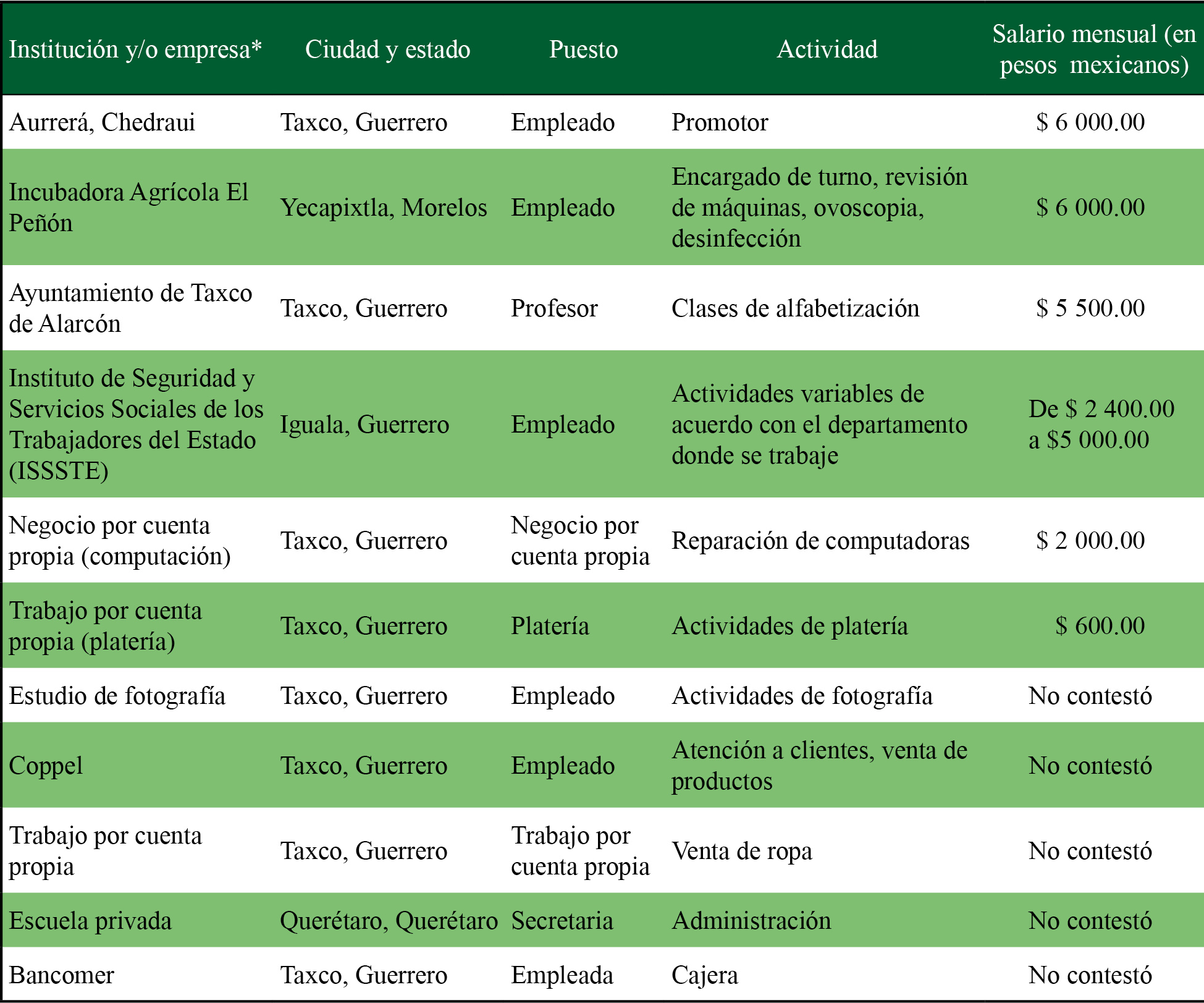 Sobre los egresados que trabajaban en ocupaciones diferentes a la geografía, los salarios estuvieron desde $6 000.00 pesos mensuales hasta $600.00 pesos mensuales (tabla 1), aquí la mayoría se encontraban en las ciudades de Iguala y Taxco (Guerrero), Yecaplixtla (Morelos) y Querétaro (Querétaro).