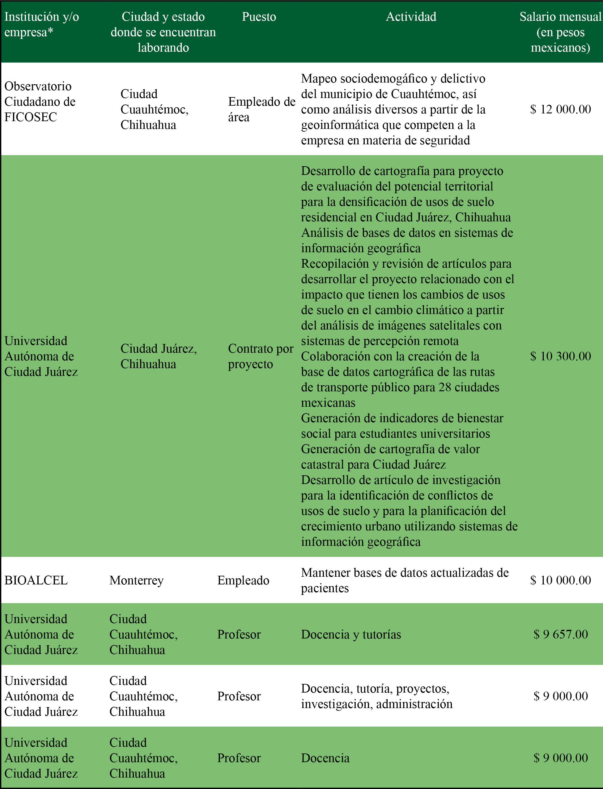 Por otra parte, de 8% (6 casos) que manifestó laborar en áreas diferentes a la geoinformática, los ingresos oscilaron desde $20 000.00 pesos mensuales como máximo hasta $3 200.00 pesos mensuales como mínimo (tabla 3). Y las ciudades donde se ubicaron fueron Anáhuac y Ciudad Cuauhtémoc (Chihuahua).