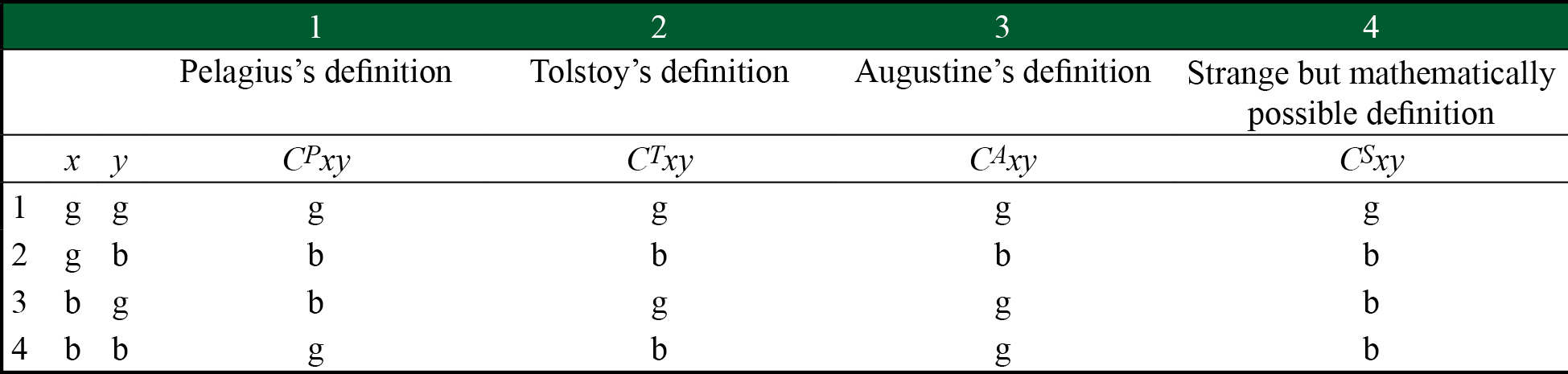 In table 1 the moral variables x and y range over the set of moral actions, which, by definition, are either morally good or bad ones. The moral-value arguments and moral-value functions take their values from the set {g (good), b (bad)}, elements of which are called moral values (of moral actions).[1] The symbol Cxy in the above table stands for the moral operation “realizing y in response to realizing x”. In CPxy the upper literal index P informs that this is Pelagius’s option of defining moral-value-function Cxy. In CTxy the upper literal index T informs that this is Tolstoy’s option of defining moral-value-function Cxy. In CAxy the upper literal index A informs that this is Augustine’s option of defining moral-value-function Cxy.