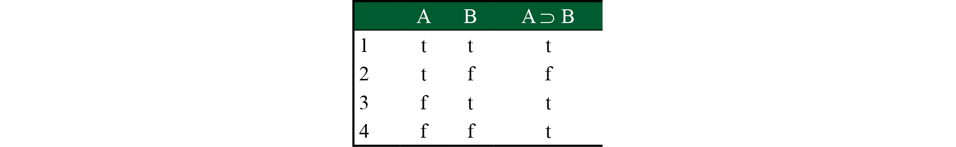 Those who are somehow acquainted with elementary symbolic logic easily notice that the column 3 of the table 1 under consideration is surprisingly similar to the below-presented well-known tabular definition of truth-functional sense of “(material) implication” in classical algebra of propositional logic. (In the below table 2: symbol “⊃” stands for the implication; letters “A” and “B” stand for propositions; letters “t” and “f” – for the truth-values “true” and “false”, respectively.) The source of the table 2 – (Kleene 1967; Mendelson 1997).