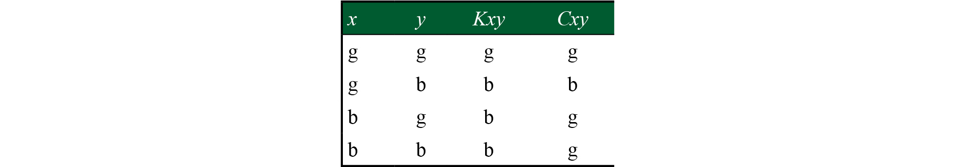 The glossary for the below-presented table 4: The symbol Kxy stands for the moral-evaluation-function “uniting, conjoining, combining moral actionsx and y in a conduct as a whole”. Cxy stands for the moral-evaluation-function “performing action y in response to action x”. (The binary algebraic operations K and C belong to the set F from the above-mentioned triple < A, F, =+= >.) The moral-evaluation-functional-sense of the mentioned operations of algebra of formal ethics of moral rigor is defined by the following table 4.