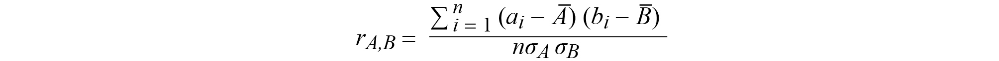 donde ai y bi son los datos i-ésimos, Ᾱ y son los valores promedio y σA y σB son los valores de la desviación estándar para los atributos A y B respectivamente y n es el número total de datos. En general, valores de rA,B cercanos a 1 y -1 corresponden a una correlación positiva o negativa, lo que significa que existe una dependencia relativa entre los dos tipos de datos A y B; la dependencia es relativa, ya que un valor de rA,B = 1 (0-1) corresponde a una nula dispersión en los datos, y a su vez corresponde al caso ideal. Valores cercanos a 0 para rA,B, corresponden a una nula relación entre las variables A y B o una muy grande dispersión de los datos. Para establecer una interpretación del valor obtenido de rA,B y ver si los datos A y B están relacionados, y dicha relación no es producto del azar, se calcula el valor de la distribución t de Student mediante la expresión: