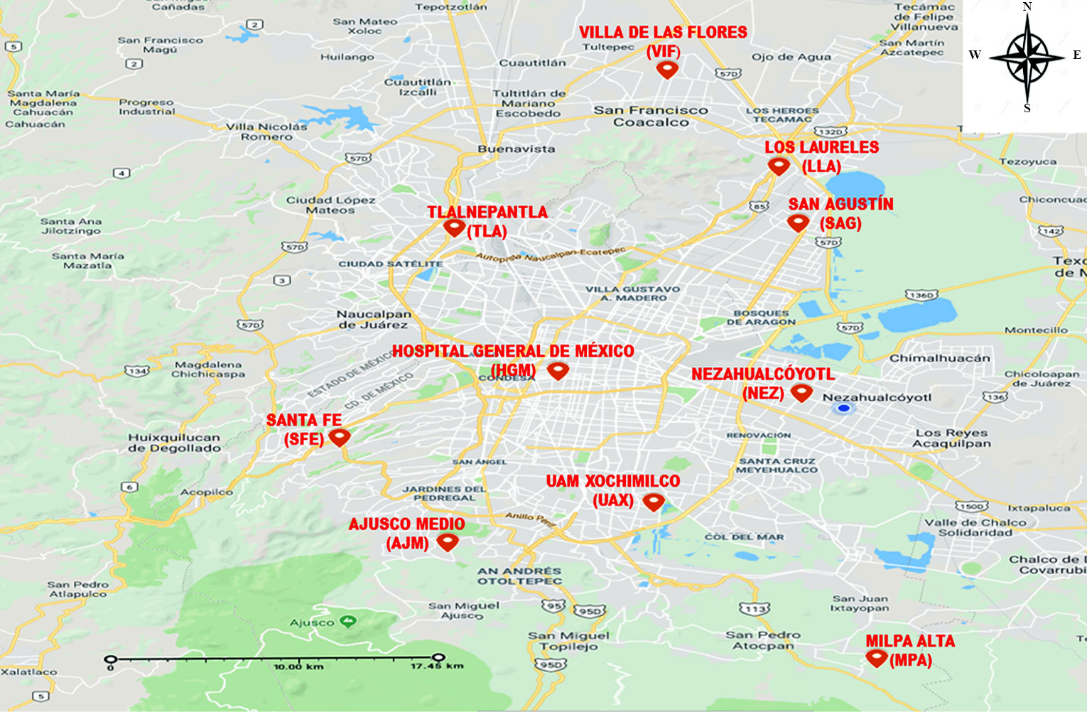 Las 10 estaciones están ubicadas en el norte, sur, poniente y oriente de la Ciudad de México a distancias considerables y se encuentran distribuidas tanto en sus alcaldías como en el Área Metropolitana (Estado de México) y tienen por nombre: Ajusco Medio (AJM), Hospital General (HGM), Los Laureles (LLA), Milpa Alta (MPA), Nezahualcóyotl (NEZ), San Agustín (SAG), Santa Fe (SFE), Tlalnepantla (TLA), UAM Xochimilco (UAX) y Villa de las Flores (VIF). Por cada mes, se tiene un total de hasta 744 datos por contaminante; los equipos de medición de algunas estaciones arrojaron datos que consideramos erróneos (números negativos), por lo que se realizó una limpieza de los datos. En la primera fase del estudio se calcula el coeficiente de correlación entre distintas partículas y gases para una misma estación durante cada mes desde enero de 2017 hasta diciembre de 2017, es decir, se eligen dos contaminantes (A y B) y las distintas combinaciones entre ellos: gas-gas, gas-partícula, partícula-partícula.