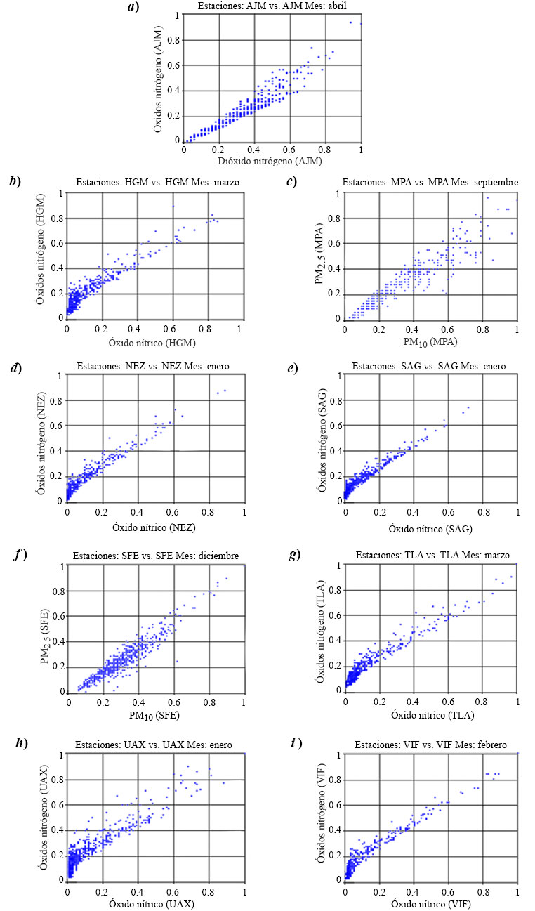 Contrario a este comportamiento, los pares de gases que contienen al CO presentan pocos meses de correlación y en pocas estaciones; la estación VIF es la única en donde la mitad del año se tiene una correlación entre el CO y el NOX. Por otra parte, las partículas PM10 presentan una importante correlación con las partículas PM2.5 y PMCO en distintas estaciones, por lo que la presencia de la PM10 se asocia de forma directa con la de la PM2.5 y de la PMCO y confirma el efecto sinérgico encontrado por Echeverri y Maya (2008) en la ciudad de Medellín. En el caso de la estación Los Laureles ubicada en Ecatepec, Estado de México, no se encontró correlación de ningún tipo. En la gráfica 1 se observa el comportamiento de los valores de concentración por pares de partículas o gases y en donde se advierte la dependencia que hay entre estos contaminantes; estas gráficas corresponden a aquellos pares de contaminantes donde se tienen los valores más altos calculados del coeficiente de correlación para cada una de las 10 estaciones. Se puede ver que la dispersión es menor cuando la correlación es más grande, lo cual verifica el cálculo correcto del coeficiente de correlación rA,B. Se reportan nueve gráficos, ya que en el caso de la estación Los Laureles (LLA) no se encontró alguna correlación significativa.