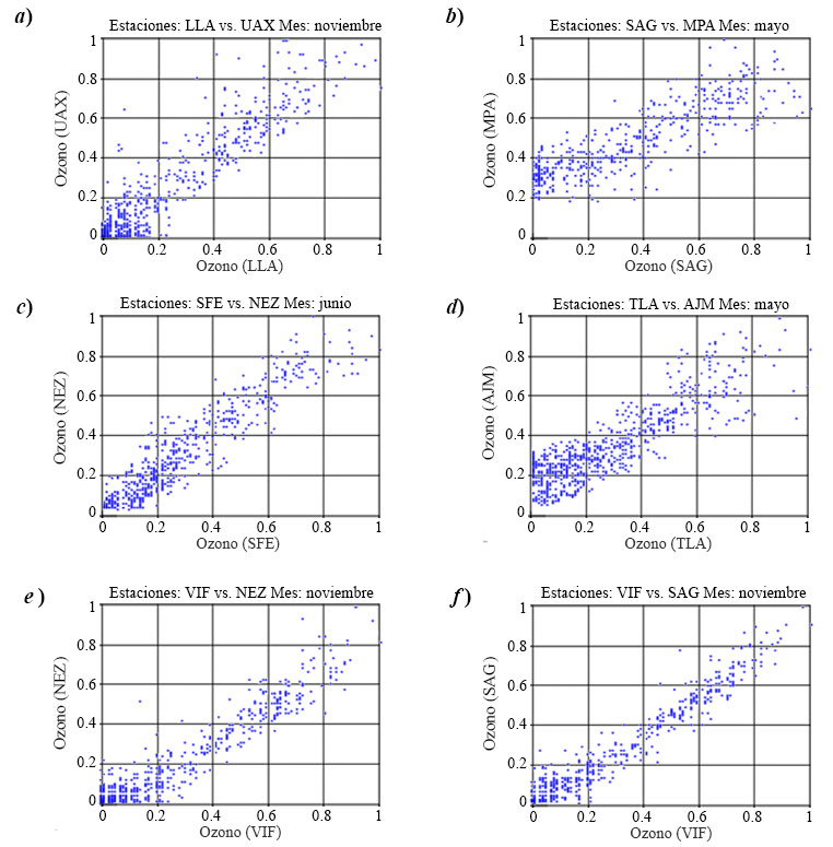 Otro resultado destacable es que se obtiene una importante correlación entre contaminantes del mismo tipo para diferentes estaciones. El caso más relevante es la estrecha relación obtenida entre el ozono de una estación respecto al de otra, como ejemplo sobresaliente se encuentra el par de Los Laureles y UAM-Xochimilco; en este proceso, las partículas suspendidas no participan en este tipo de correlación. Para analizar este comportamiento del ozono, y como trabajo a futuro, podría investigarse la forma como aumentan los óxidos de nitrógeno NOX y el monóxido de carbono CO durante noviembre (mes en el que se encontró la más alta de las correlaciones correspondiente a las estaciones Los Laureles y UAM-Xochimilco), ya que estos compuestos dan origen al ozono al reaccionar en la atmósfera en presencia de luz solar.