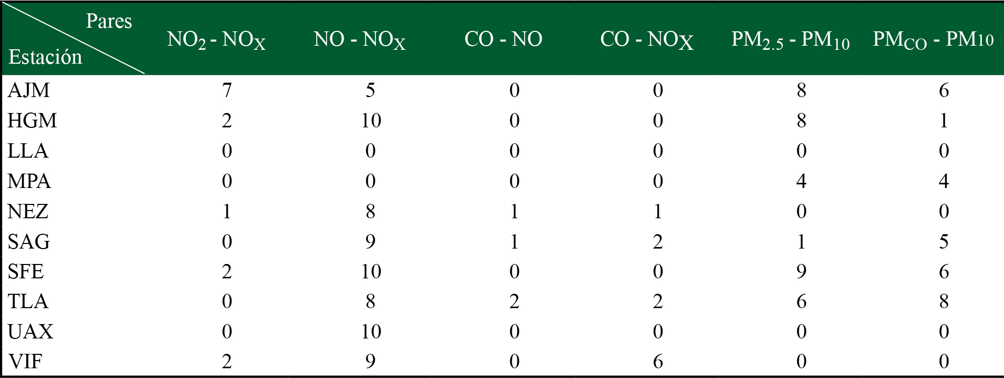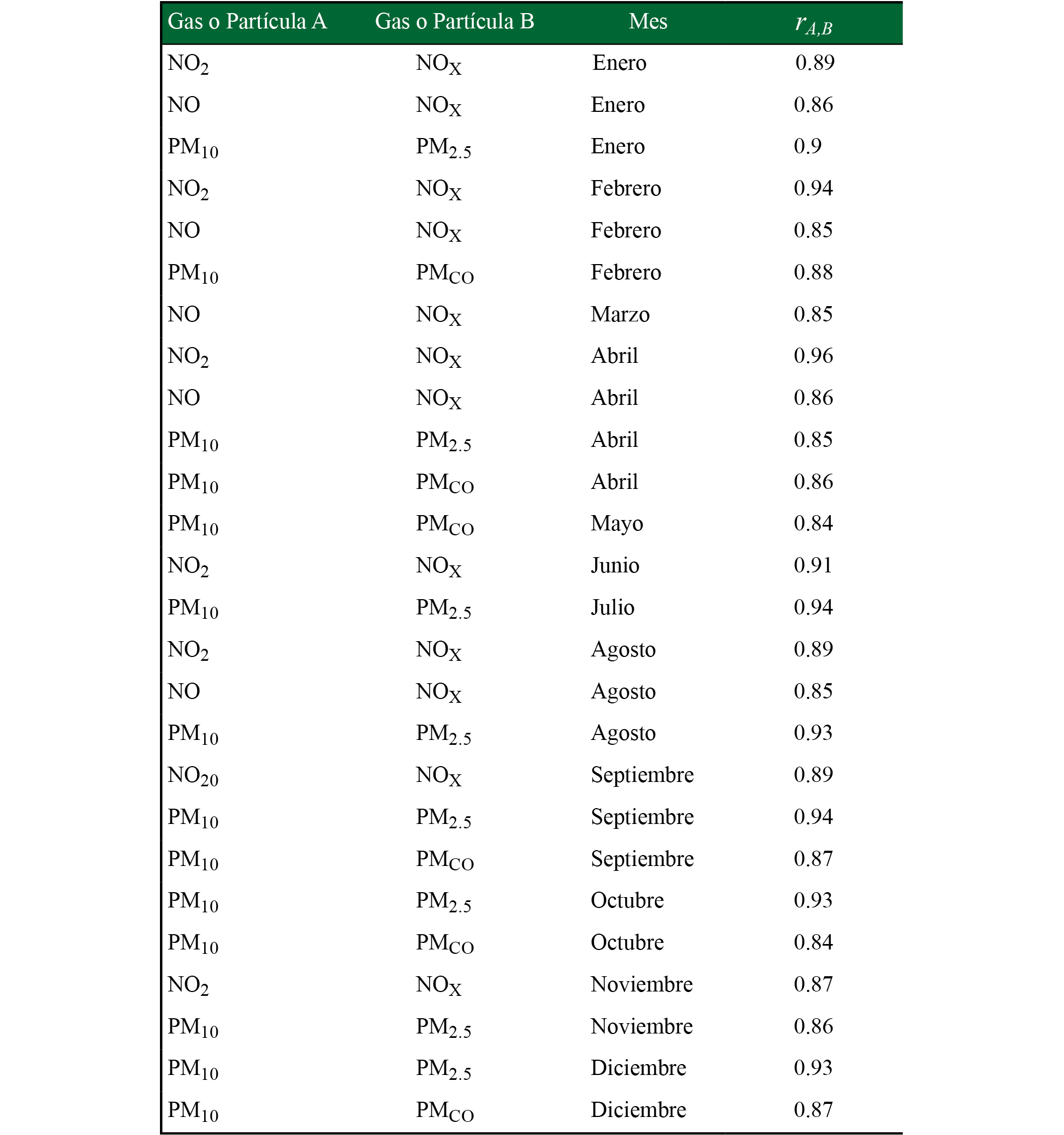 Al estudiar los datos obtenidos de las mediciones realizadas durante 2017 en algunas de las estaciones de monitoreo del sistema RAMA ubicadas en distintos puntos de la Ciudad de México y el Área Metropolitana, se encontró que existe una correlación significativa entre distintas partículas para una misma estación. Se reporta correlación entre los pares de gases y partículas NO2-NOX, NO-NOX, CO-NO, CO-NOX, PM2.5-PM10, PMCO-PM10; esto significa que la concentración de algunos gases y partículas muestran una importante dependencia de la concentración de otros gases y partículas para una misma estación. En el caso de los compuestos con nitrógeno, la dependencia puede deberse a que el NO y el NO2 son dos de los compuestos que forman parte del total de óxidos de nitrógeno NOX. El comportamiento de los pares de partículas PM se explica de forma similar, ya que las partículas PM2.5 y PMCO son parte del rango definido para las partículas PM10. No se encontró correlación entre gases con partículas suspendidas.