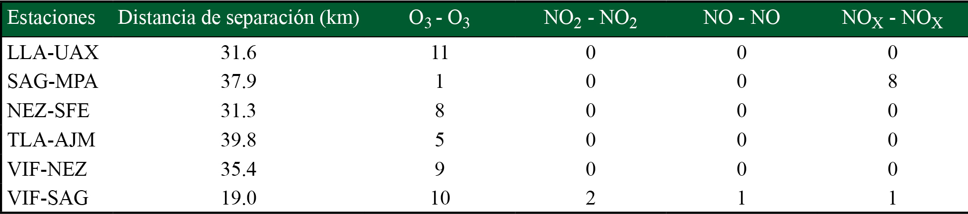 Por otra parte, se realizó el cálculo del coeficiente rAB para las partículas o gases, pero de dos diferentes estaciones. De esta forma, se busca ver la relación entre la partícula o gas de alguna estación (atributo A) respecto a la partícula o gas de otra estación (atributo B). Se eligieron cinco pares de estaciones, cuya separación fuera mayor a 30 km de distancia y una estación con separación de 19 km de distancia. En el cuadro 3 se muestran los pares de estaciones, su distancia y el número de veces en el que las partículas o gases están correlacionadas con un coeficiente de correlación mayor a 0.8. Es visible que en la mayoría de los casos la más alta correlación entre dos estaciones se da entre el gas O3 (ozono) de una estación respecto del gas O3 de otra; el mayor número de meses que están correlacionados por este gas entre dos distintas estaciones es de 11, y corresponde al O3 de la estación Los Laureles (LLA) y el O3 de la estación UAM-Xochimilco (UAX). En la combinación de las estaciones Villa de las Flores con San Agustín (VIG-SAG) se registraron correlaciones NO2-NO2, NO-NO y NOX-NOX, pero sólo en 2, 1 y 1 meses respectivamente; en todas las demás combinaciones posibles entre partículas y gases entre diferentes estaciones no se registró una correlación apreciable.