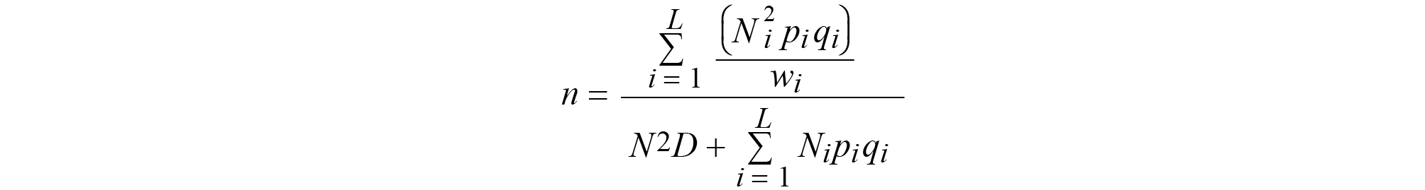 Para el cálculo del tamaño de muestra se tomó en cuenta que la población se distribuye en grupos (estratos) para reducir el error y se utiliza un cuestionario con demasiadas preguntas (Rojas, 2013), por lo que se empleó la fórmula para una muestra estratificada (Scheaffer et al., 2007).