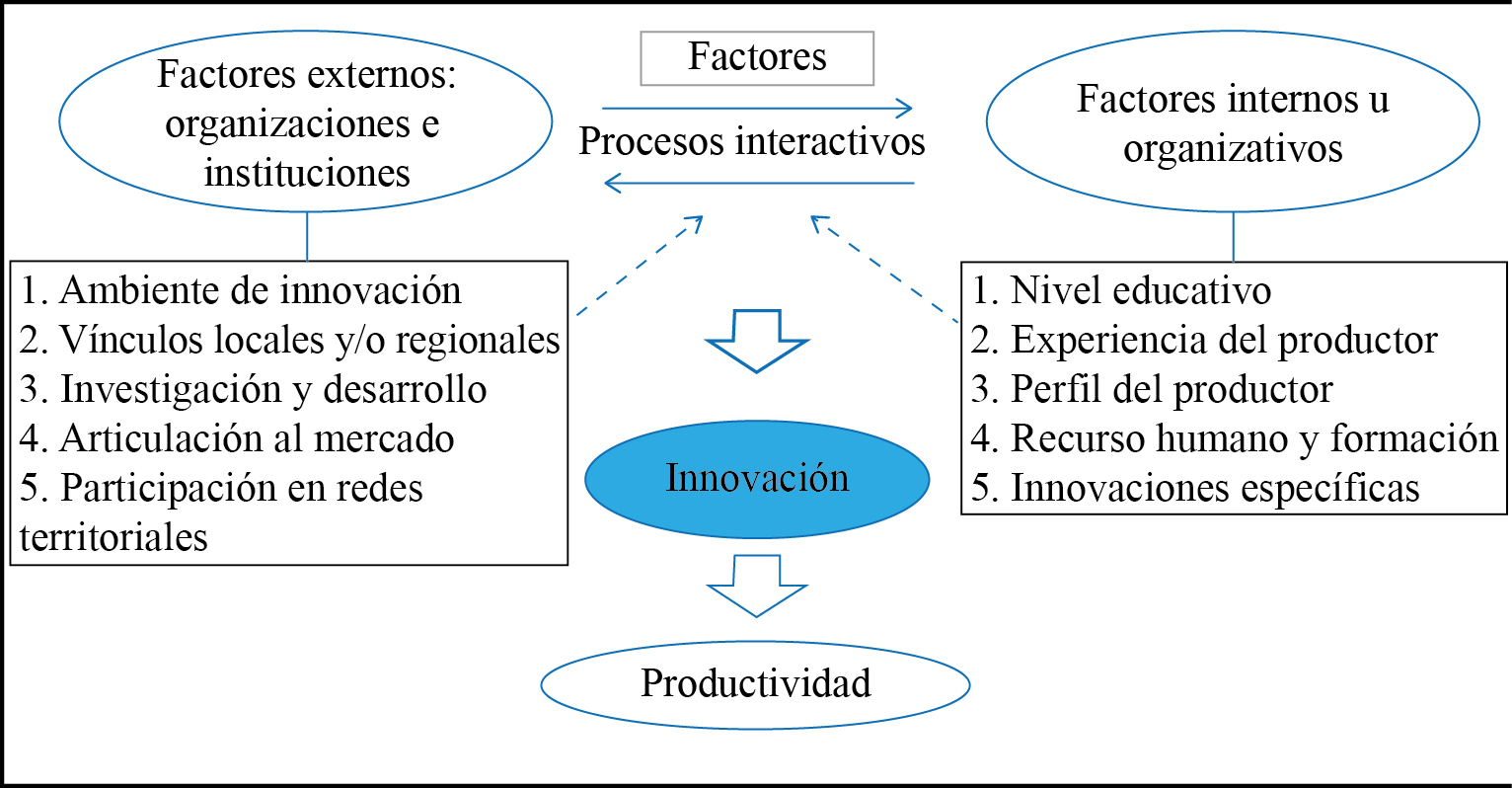 Para el sector agropecuario no se puede decir que exista un modelo de innovación único, pero existen elementos que ayudan a entender las interacciones en un sistema, entre los cuales se pueden mencionar: nivel educativo, experiencia del productor, perfil del productor, recurso humano y formación, cambios generados o innovaciones específicas, ambiente de innovación, vínculos locales y/o regionales, investigación y desarrollo, articulación al mercado, participación en redes sociales, considerados dentro de un ámbito local y/o regional, en el que el actor principal, es el productor o las unidades de producción de una determinada localidad o región (FAO, 2012a; Rugeles, 2014).