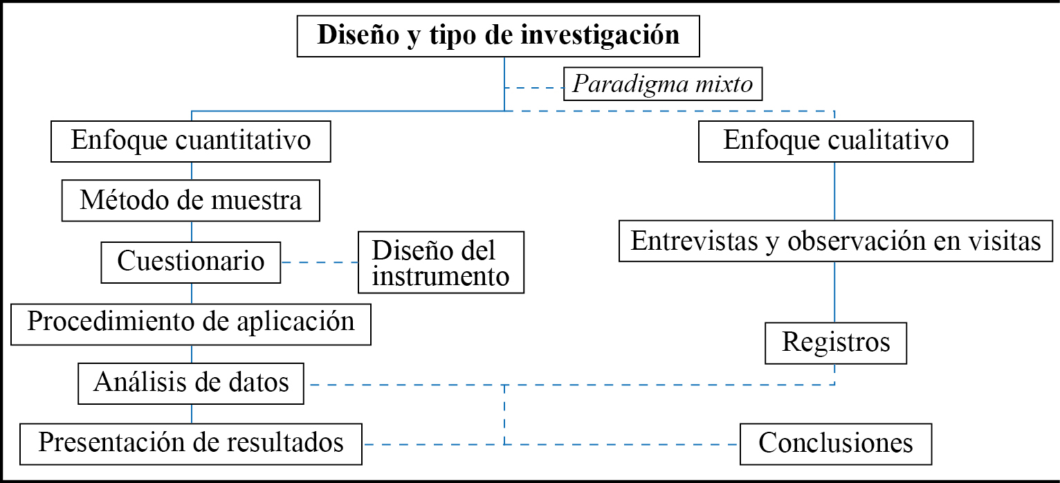 El análisis comprendió un periodo, por lo que el diseño de investigación no experimental es de tipo transeccional o transversal, es decir, se hace un corte en el tiempo. De acuerdo con Hernández et al. (2014), se busca describir variables, analizar su incidencia e interrelación de factores en un momento dado; para ello, se tomaron como referencia investigaciones realizadas en el sector agropecuario por Rugeles et al. (2013) y Rugeles (2014), quienes refieren que un intervalo de dos a cinco años anteriores es suficiente para acotar y poder inferir sin que se alteren los resultados. Se hace alusión al paradigma mixto, es decir, se apoya del enfoque cuantitativo y cualitativo, con mayor uso del cuantitativo, puesto que lleva un proceso más definido al existir un tamaño de muestra, un instrumento estructurado para la colección de información, un procedimiento de aplicación y estadísticos definidos y el segundo enfoque lo complementa con entrevistas y registros de campo menos estructurados (figura 2). Este enfoque se hizo para la cualificación de datos cuantitativos que arrojó el cuestionario.