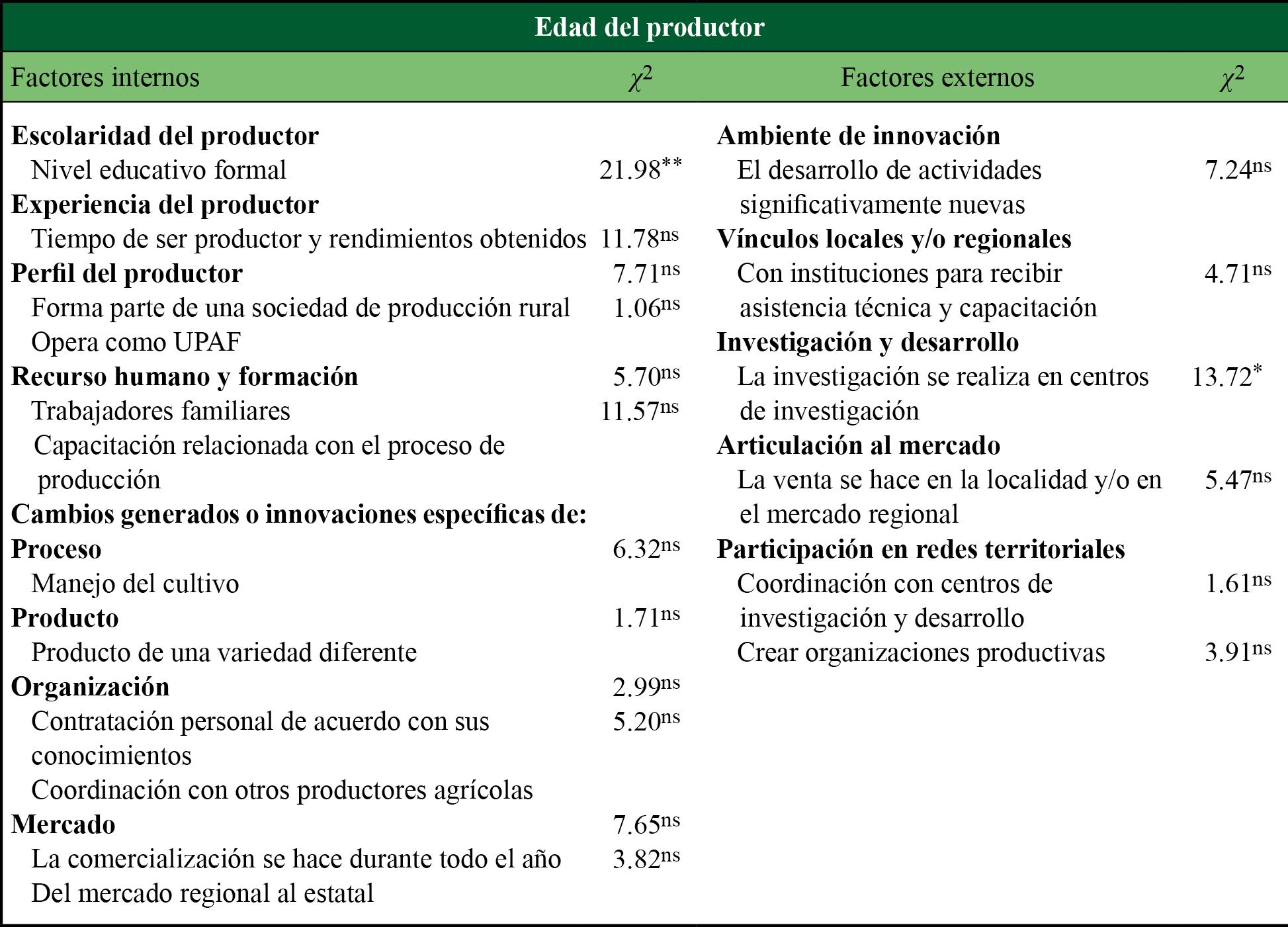 De la variable considerada en el modelo teórico y operacionalizada para su análisis, dentro de la dimensión de factores internos, la edad del productor resultó independiente de las innovaciones (5.90nsp > 0.05) que se generan en las UPAF (cuadro 1). Es decir, la edad de los productores de las UPAF no es un factor influyente para realizar procesos de innovación en cada uno de los cultivos indicados, situación observada para la dimensión de factores externos (cuadro 1), realidad que no coincide con lo reportado por Rugeles (2014) para unidades de producción agrícola en Colombia, donde la edad resultó ser determinante. Sin embargo, los resultados obtenidos en la presente investigación se justifican, ya que para innovar se requiere voluntad y acción que no necesariamente tiene que ver con la edad (Valencia y Patlan, 2011).