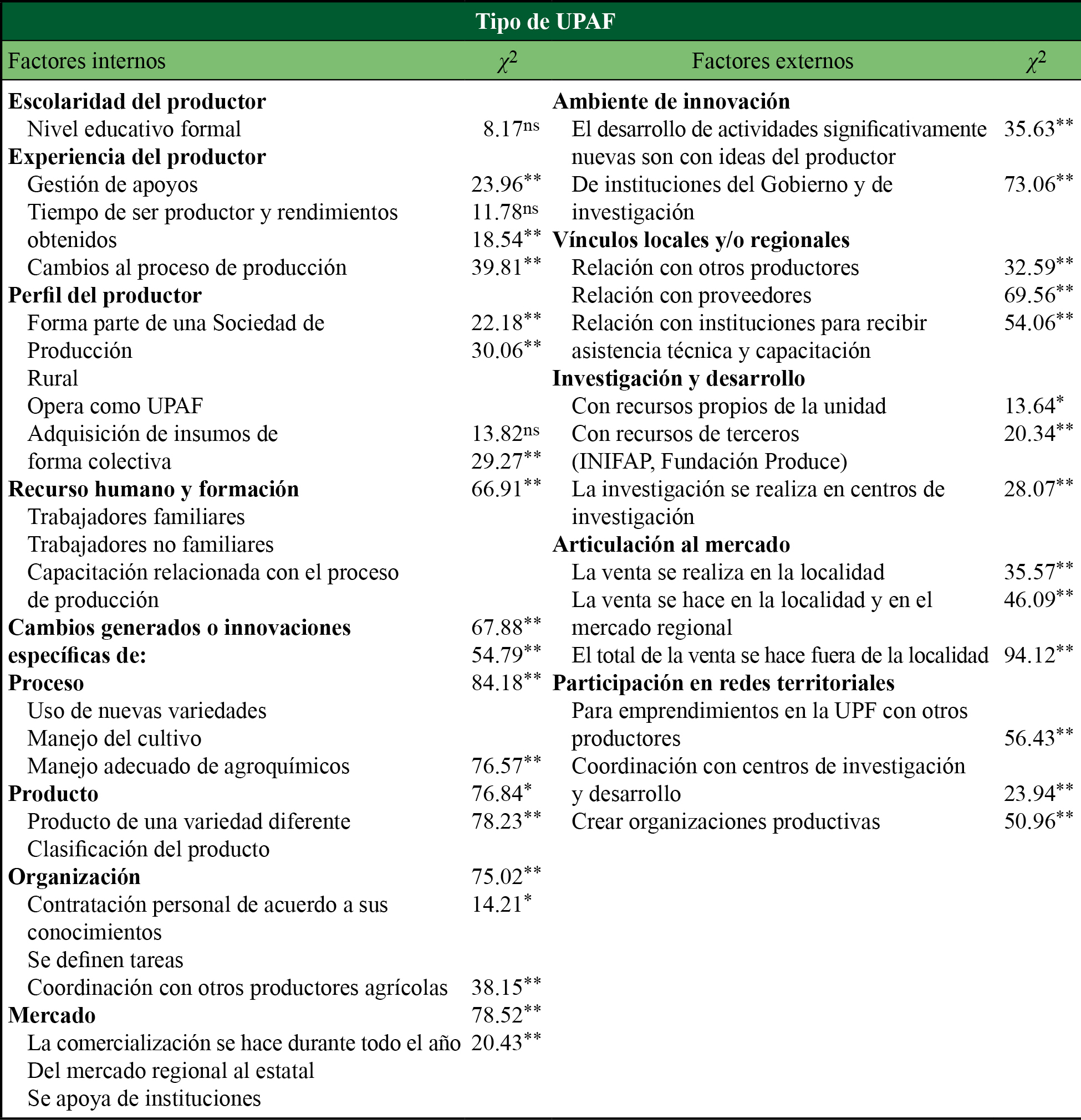 Existe una fuerte dependencia entre las UPAF y los tipos de innovación (p < 0.01), y, de acuerdo con Rendón y Aguilar (2013), cuando existen modelos alternativos de adopción de tecnologías se promueven diferentes tipos de innovación con la participación de receptores como son los productores y la vinculación con instituciones, en este caso los procesos interactivos entre factores. El tipo de UPAF determina un mayor grado de interacción entre factores y al mismo tiempo el desarrollo de diferentes innovaciones, por lo que, de acuerdo con el cultivo que se considere como principal, el productor realiza más actividades de organización, mercado y, como consecuencia, procesos de producción diferentes (cuadro 2).