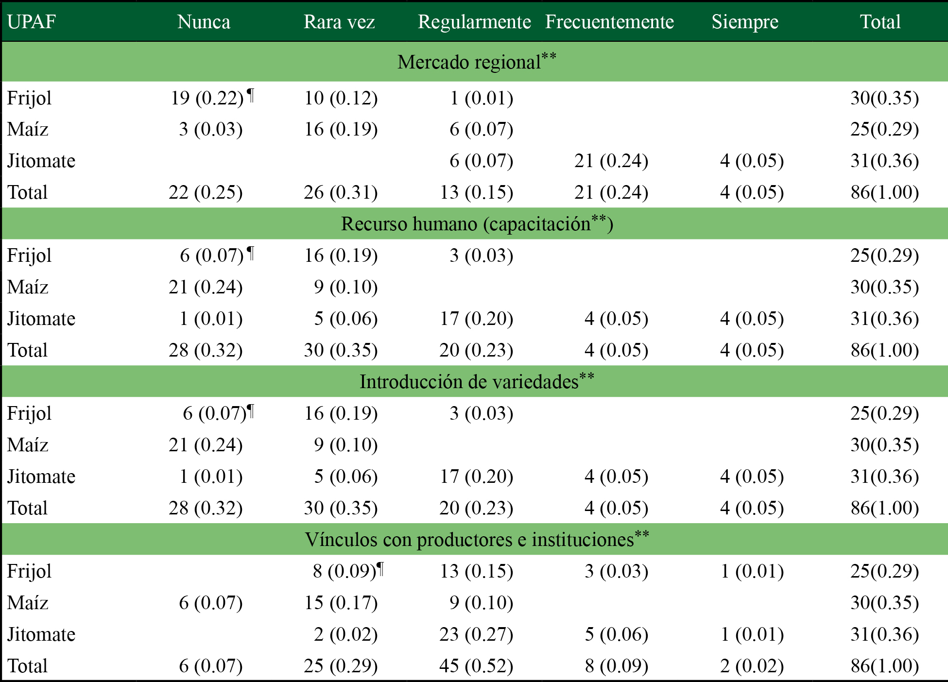 Referente a la participación de los productores en el mercado, se observa una marcada relación inversa entre las UPAF de maíz y frijol contra las de jitomate, ya que la tendencia de estas últimas es significativa con un valor de χ2 = 94.13** y p < 0.0001, con una tendencia hacia una participación mayor a otros mercados, caso contrario con las primeras (cuadro 3). Es importante destacar que aun cuando existen diferencias entre UPAF para participar en mercados distintos al local, 56% de éstas nunca o rara vez participa en mercados regionales y 36% lo hace con regularidad o frecuentemente, porcentaje que corresponde a las UPAF de jitomate consideradas en la muestra.
