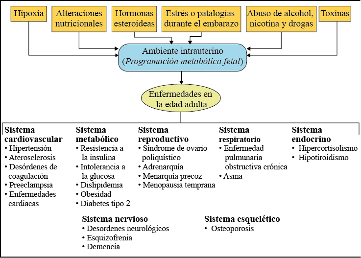 Los factores mencionados, y los cuales inducen una programación metabólica, han demostrado tener efectos deletéreos a largo plazo en diferentes sistemas fisiológicos en la edad adulta como a) el sistema cardiovascular (relacionado con enfermedades como la hipertensión, la aterosclerosis, desórdenes de la coagulación, preeclampsia y enfermedades cardiacas, b) el sistema metabólico (relacionado con la resistencia a la insulina, la intolerancia a la glucosa, la dislipidemia, la obesidad y diabetes tipo 2), c) el sistema reproductivo (relacionado con el síndrome de ovario poliquístico, la adrenarquía, la menarquía precoz y la menopausia temprana, d) el sistema respiratorio (relacionado con la enfermedad pulmonaria obstructiva crónica y asma), e) el sistema endocrino (relacionado con el hipercortisolismo e hipotiroidismo), f) el sistema nervioso (relacionado con desordenes neurológicos, esquizofrenia y demencia) y g) el sistema esquelético (relacionado con la osteoporosis) (figura 2) (Fowden et al., 2006; Carpinello et al., 2018). Es importante recalcar que la mayoría de las enfermedades mencionadas están relacionadas con el síndrome metabólico.