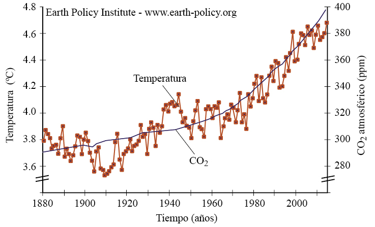 Los datos de la NOAA (National Oceanic and Atmospheric Administration) han servido de base para innumerables estudios científicos que demuestran un incremento gradual de la temperatura media del planeta (Petit et al., 2009; Barry y Chorley, 2003; Brohan et al., 2006) (gráfica 1). Este aumento es de casi 0.5 °C si tomamos como base la temperatura media registrada entre 1961 y 1990, y de casi 1 °C si la comparamos con la segunda mitad del siglo XIX, esto es, entre 1850 y 1900 (Caballero et al., 2007). El calentamiento global ha ido de la mano con una tendencia hacia un incremento en el CO2 atmosférico, lo que es un fuerte indicador de que una de las principales causas de la tendencia hacia el calentamiento es la intensificación del efecto invernadero (Caballero et al., 2007). De allí que con frecuencia se usen indistintamente ambos términos, pero mientras uno describe el fenómeno del incremento de temperatura, el otro se refiere al mecanismo que lo causa (Caballero et al., 2007).