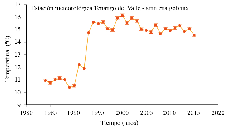 El calentamiento global es también detectable a nivel local. En la gráfica 2 se muestran los datos obtenidos de la estación meteorológica de Tenango del Valle, Estado de México, donde se evidencia que a partir de la década del 2000 se incrementa constantemente la temperatura del aire. A pesar de que se observan temperaturas bajas en las décadas de los ochenta y noventa, la tendencia a la elevación de las temperaturas ambientales es irrefutable, por lo que hay un claro consenso científico que alerta de las consecuencias de este incremento de temperatura. Por ejemplo, el último informe emitido por el Panel Intergubernamental sobre el Cambio Climático (IPCC por sus siglas en inglés) de la ONU, el cual está conformado por miles de científicos de todo el mundo, nos informa que estamos próximos a pasar el umbral crucial de 1.5 °C por encima de los niveles de temperatura preindustriales, lo que cambiaría ecosistemas desertificándolos, aumentarían las sequías extremas y lo incendios naturales, así como las inundaciones (IPCC, 2018).