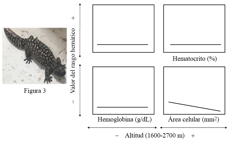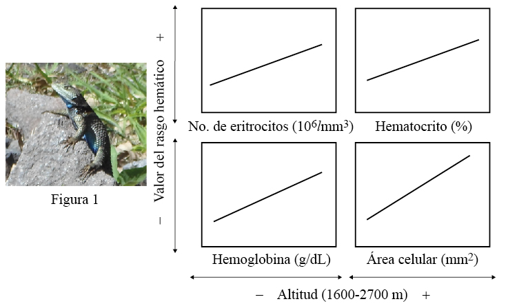 En México se han estudiado a detalle tres lacertilios: Sceloporus torquatus (González-Morales et al., 2015), Sceloporus grammicus (González-Morales et al., 2017) y Heloderma horridum (Guadarrama et al., 2019). Sceloporus torquatus, cuyo nombre común es lagartija de collar o chintete, es una lagartija saxícola (Feria-Ortíz et al., 2001) que se distribuye en el centro de México. De acuerdo con la NOM-059-ECOL-2010, es una especie endémica de México y no está sujeta a ningún tipo de protección especial (Flores-Villela y Gerez, 1994; Uribe-Peña et al., 1999; Méndez de la Cruz y Gutiérrez-Mayen, 1991). Presenta además un tamaño o longitud del hocico a la cola de entre 15 y 20 centímetros y cuando los machos son adultos muestran coloración azul en la gula y en los parches laterales, lo que la hace una lagartija muy llamativa para su extracción ilegal y venta como mascota. Se ha estudiado porque tiene un amplio rango de distribución altitudinal, pues habita desde los 1 450 hasta los 3 000 m de altitud y es abundante en zonas moderadamente perturbadas. Esta lagartija despliega respuesta hemática a la hipoxia: incrementa sus valores sanguíneos y con ello su capacidad para transportar oxígeno de los pulmones a los tejidos (González-Morales et al., 2015) (gráfica 3, figura 1). Wheathers y White (1972) fueron los primeros en mostrar que un ectotermo puede responder a la hipoxia y con este conocimiento se hizo factible predecir una migración altitudinal de las lagartijas en el futuro. Sin embargo, aún es necesario entender si la biología térmica de estos organismos le podría permitir dicha migración.