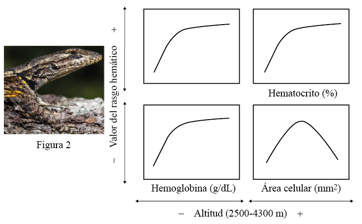 Sceloporus torquatus, en su caso, puede ser considerada como una especie euritérmica o que tiene un amplio rango de temperaturas de selección, que en el laboratorio van desde los 22.4 a los 33.7 ºC (Rivera-Rea et al., 2018), por lo que podríamos considerar con estos estudios que S. torquatus puede migrar en un gradiente altitudinal y evitar los efectos del calentamiento global. Por otra parte, realizamos otro estudio utilizando una de mayor altitud, Sceloporus grammicus, que es una lagartija arborícola que se distribuye en el centro de México. Su nombre común es lagartija del mezquite y habita desde los 450 m hasta los 4 600 m de altitud; de acuerdo con la NOM-059-ECOL-2010, es una especie que no está sujeta a ningún tipo de protección especial (Flores-Villela y Gerez, 1994; Uribe-Peña et al., 1999; Méndez de la Cruz y Gutiérrez-Mayen, 1991). Esta lagartija presenta respuesta hemática e incrementa sus valores sanguíneos hasta los 3 600 m de altura; sin embargo, las poblaciones a los 4 400 m presentan valores similares a poblaciones relativamente bajas (González-Morales et al., 2017) (gráfica 4, figura 2). Este fue el primer estudio que demostró que hay más de una manera para responder a la hipoxia, dado que existen poblaciones por encima de los 4 000 m, pero no muestran incrementos en sus valores hematológicos, adecuaciones morfofisiológicas no entendidas hasta el momento (González-Morales et al., 2017).