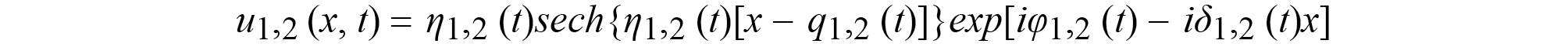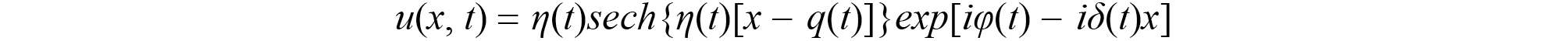 que tiene cuatro parámetros ajustables: η(t) la amplitud, q(t) la posición del centro de masa, φ(t) la fase, y δ(t) la velocidad del solitón. En presencia de perturbaciones, los parámetros del solitón varían lentamente con el tiempo causando modificaciones en su forma y velocidad.