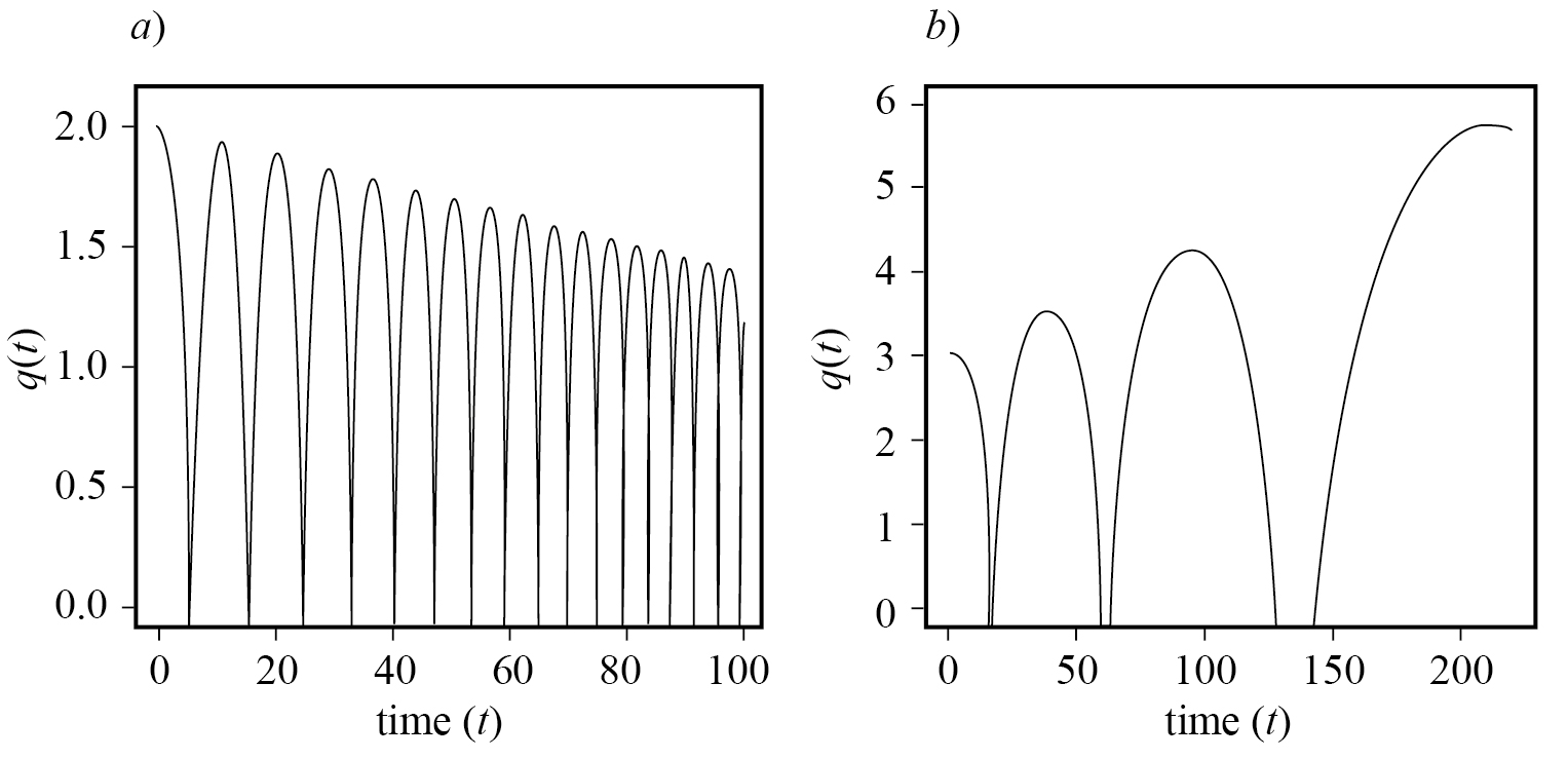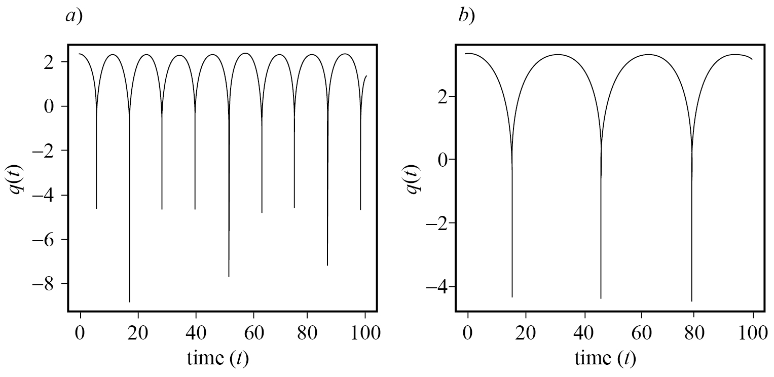 La separación relativa q(t) (q(t) ≥ 0 es positiva por definición y se vuelve negativa en las zonas de unión como se muestra en la gráfica 1 (a) y (b), donde obviamente la relación q(t) ≥ 0 no funciona. Los solitones cuando están en fase forman un estado ligado periódico. En el caso cuando la separación inicial es pequeña, los solitones colisionan en periodo muy corto (gráfica 2). Cuando los solitones están fuera de fase no se forma el estado ligado cuando γ = 0 (gráfica 3).