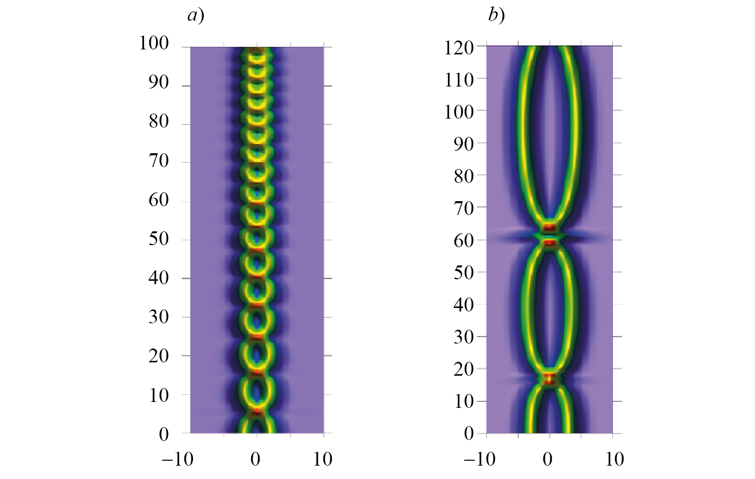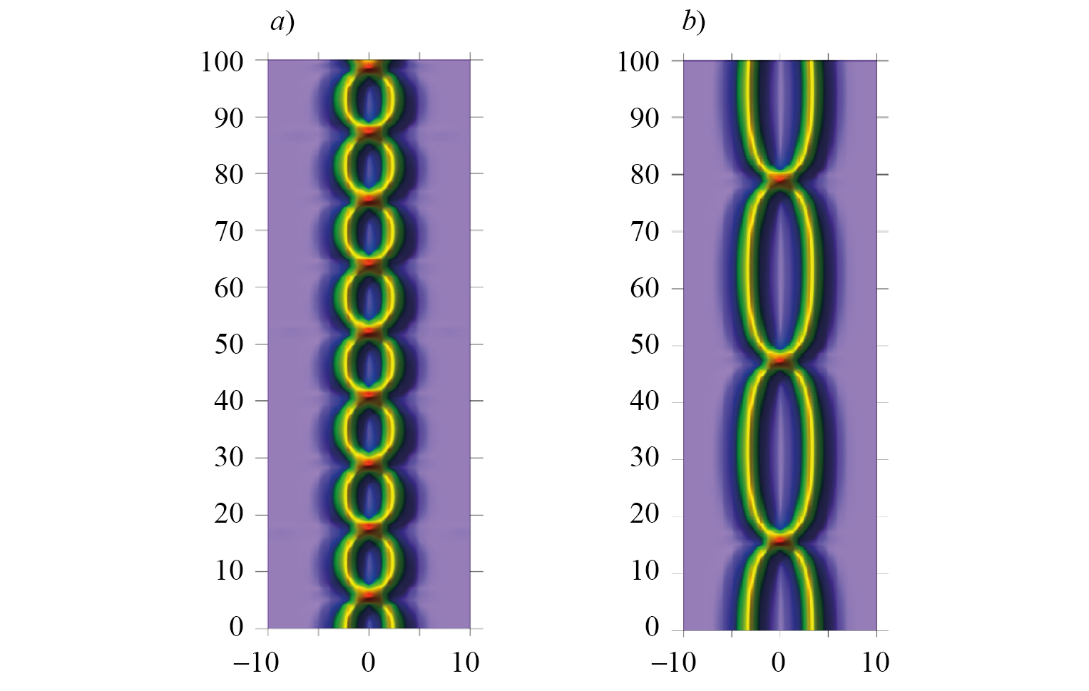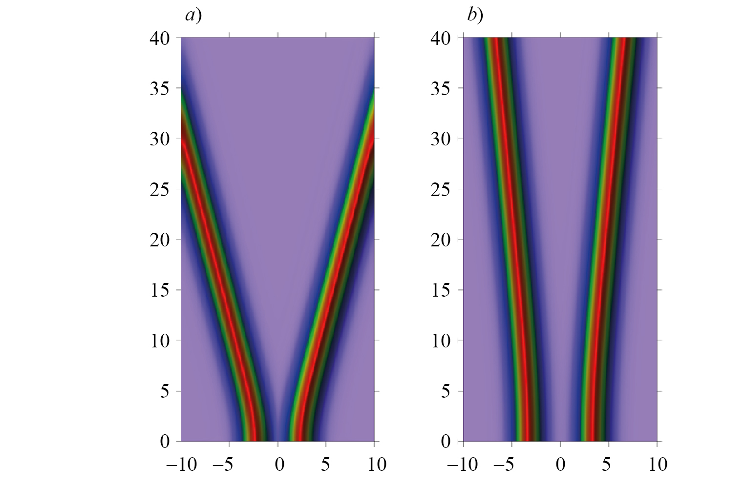Vamos a considerar la dependencia de las distancias entre dos solitones. Para la interacción de solitones que estuvieron inicialmente en fase (φ = 0), la distancia de separación es