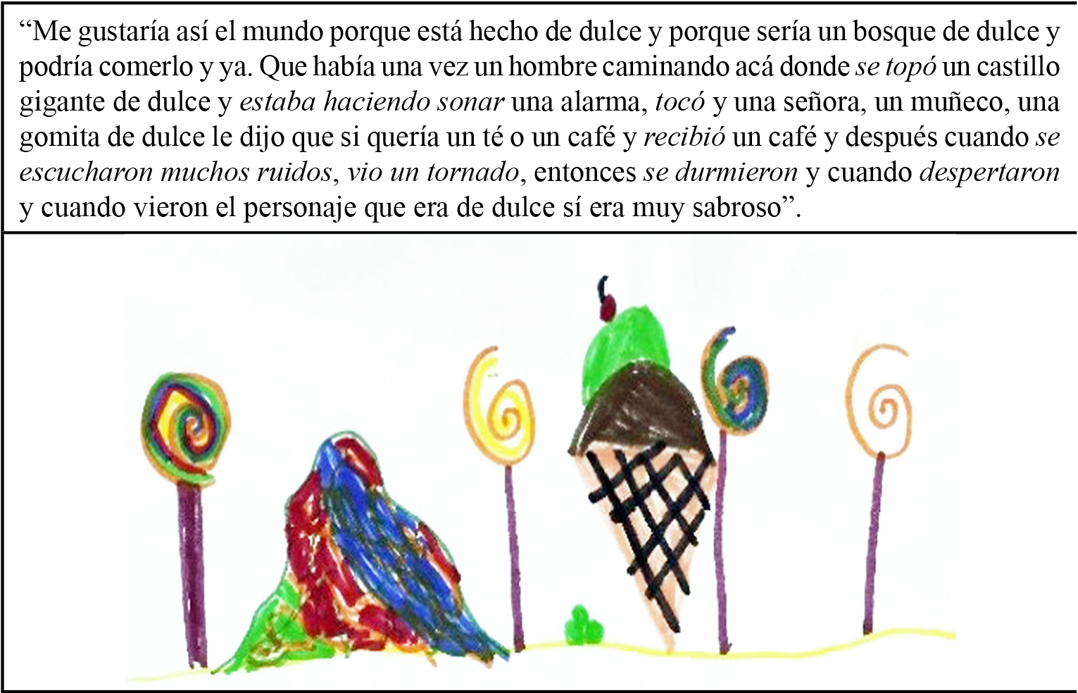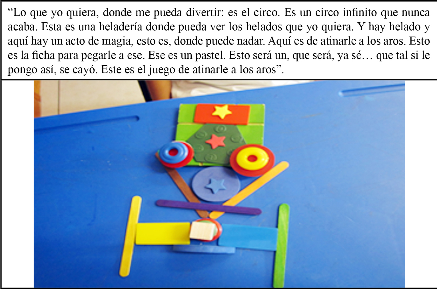 Es importante señalar que los medios materializados y los perceptivos mediatizan las acciones del niño, lo cual contribuye con la producción enriquecida de narraciones novedosas con mayor facilidad que en el caso de las acciones verbales. Esto quiere decir que los niños usan las figuras para crear nuevos objetos y representar las acciones características de esos objetos que imaginan. Por ejemplo, mientras crean la historia, los niños usan los objetos en un 45%. El 35% elige sólo las figuras que necesita y el 65% utiliza todas las figuras para crear el lugar de diversiones. Respecto a las acciones perceptivas se observó que los dibujos contribuyen con la creación de nuevas historias en un 55%. En el caso de las acciones verbales sólo el 16% accede sin apoyo, el 37% accede con apoyo de la conversación dialógica, la repetición de la instrucción y la formulación de preguntas orientadoras y el 47% no accede a la tarea de creación de historia con su personaje favorito.