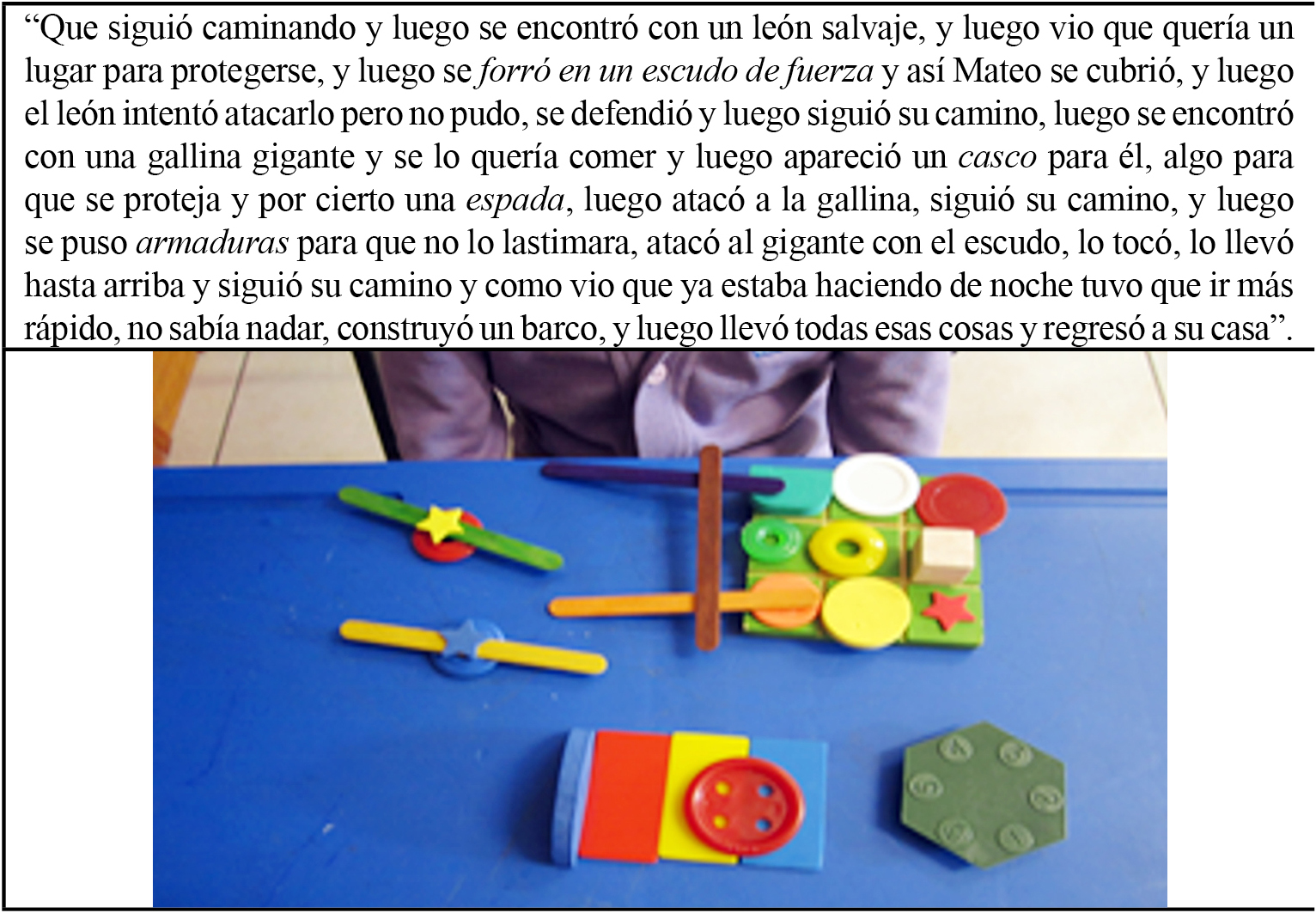En el nivel materializado se encontró que los niños a) usan figuras como signos mediatizadores para resolver la situación planteada de manera novedosa (respuesta más frecuente), b) proponen diversos medios simbólicos estableciendo relaciones entre las acciones que explican, c) al usar medios materializados se involucran emocionalmente en la narración que crean (respuesta menos frecuente).