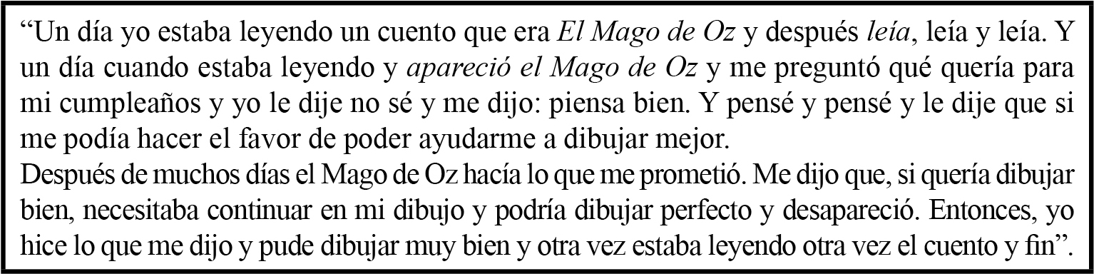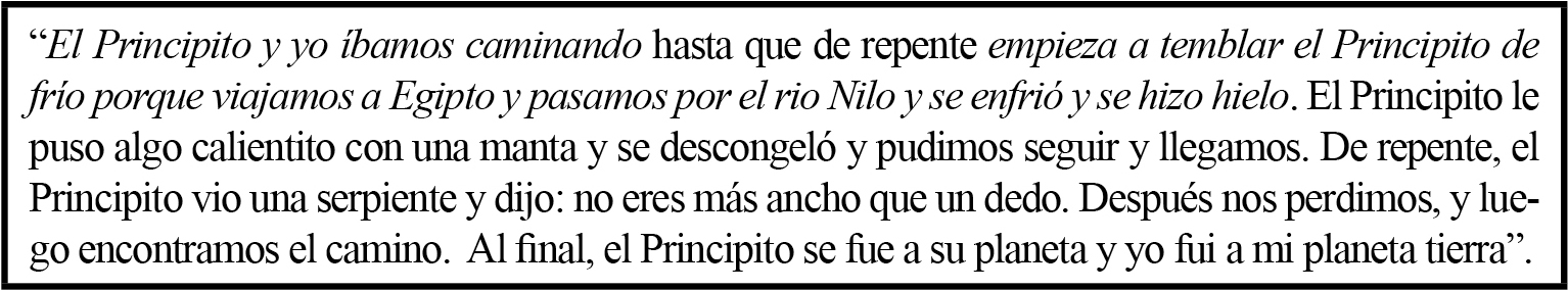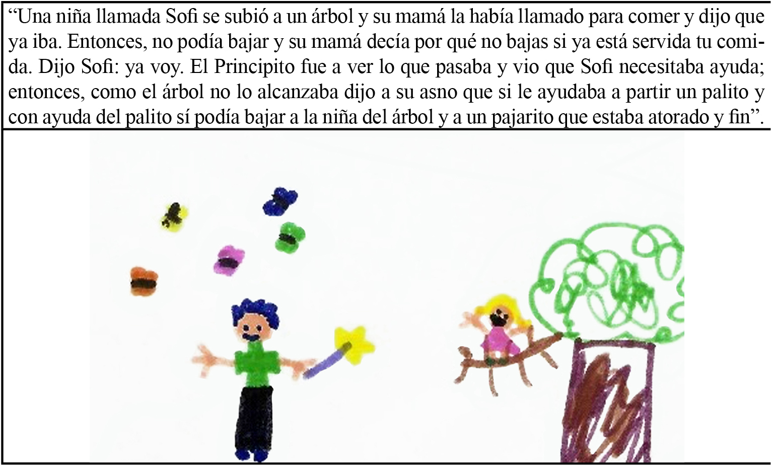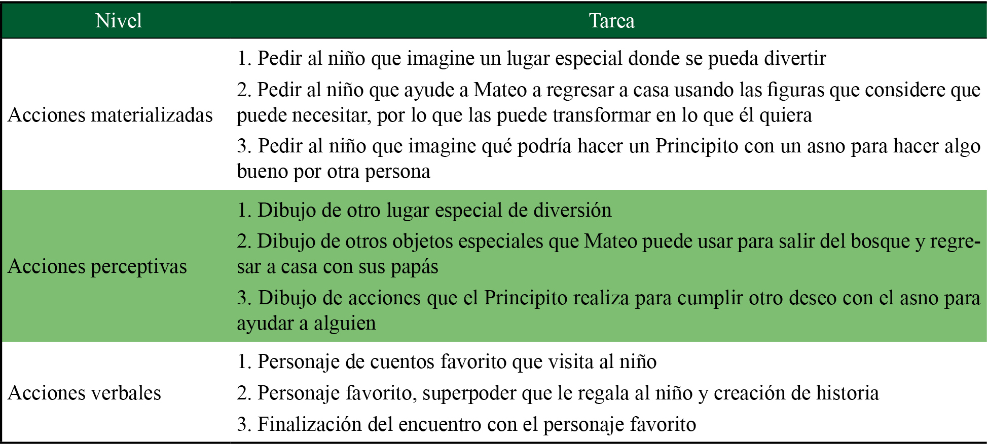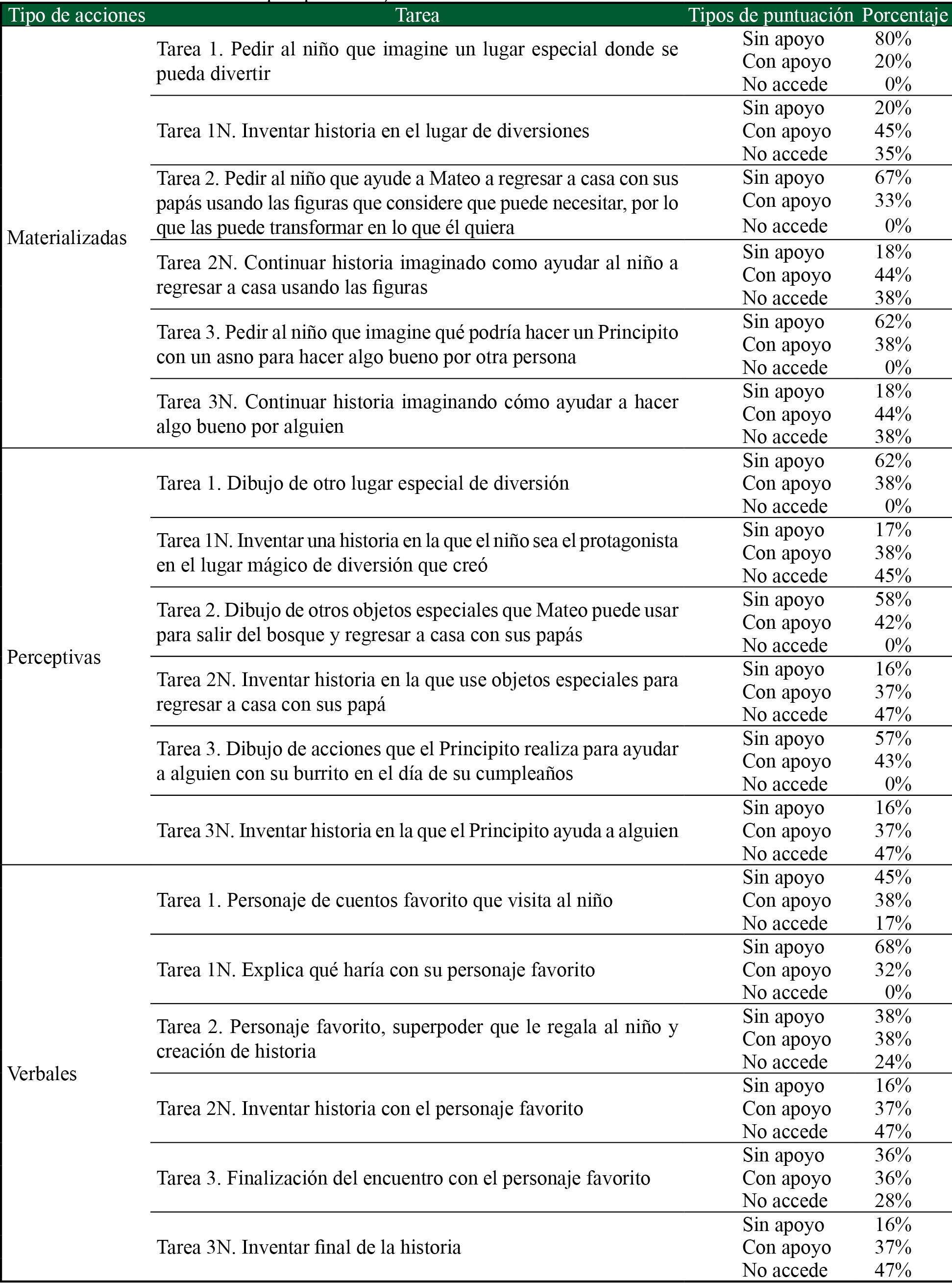 Se hizo el análisis de la realización de la tarea con uso de medios simbólicos diversos: materializado (objetos como sustitutos de otros), perceptivo (imágenes visuales-dibujos) y verbal (palabra). En el caso de las acciones materializadas tiene que ver con el uso de figuras como sustitutos objetales para representar un lugar, para crear un objeto y resolver una situación problema y para crear una situación en la que un Principito ayuda a alguien con un asno. En el caso de las acciones perceptivas el uso de medios simbólicos se dirige a la elaboración de dibujos para resolver las situaciones que se plantearon en las acciones materializadas, pero desde otra perspectiva, es decir, con una mirada nueva. En el caso de las acciones verbales el uso de medios simbólicos se orienta a resolver algunas situaciones relacionadas con el lenguaje verbal para explicar qué haría el niño si su personaje favorito lo visita o si su personaje favorito le regala un “superpoder”, así como proponer una manera de finalizar su encuentro con el personaje favorito que eligió. El segundo tipo de análisis se dirige a crear o continuar una historia (Tarea N) en cada una de las tres tareas de cada nivel de desarrollo de la imaginación creadora: acciones materializadas, acciones perceptivas y acciones verbales.