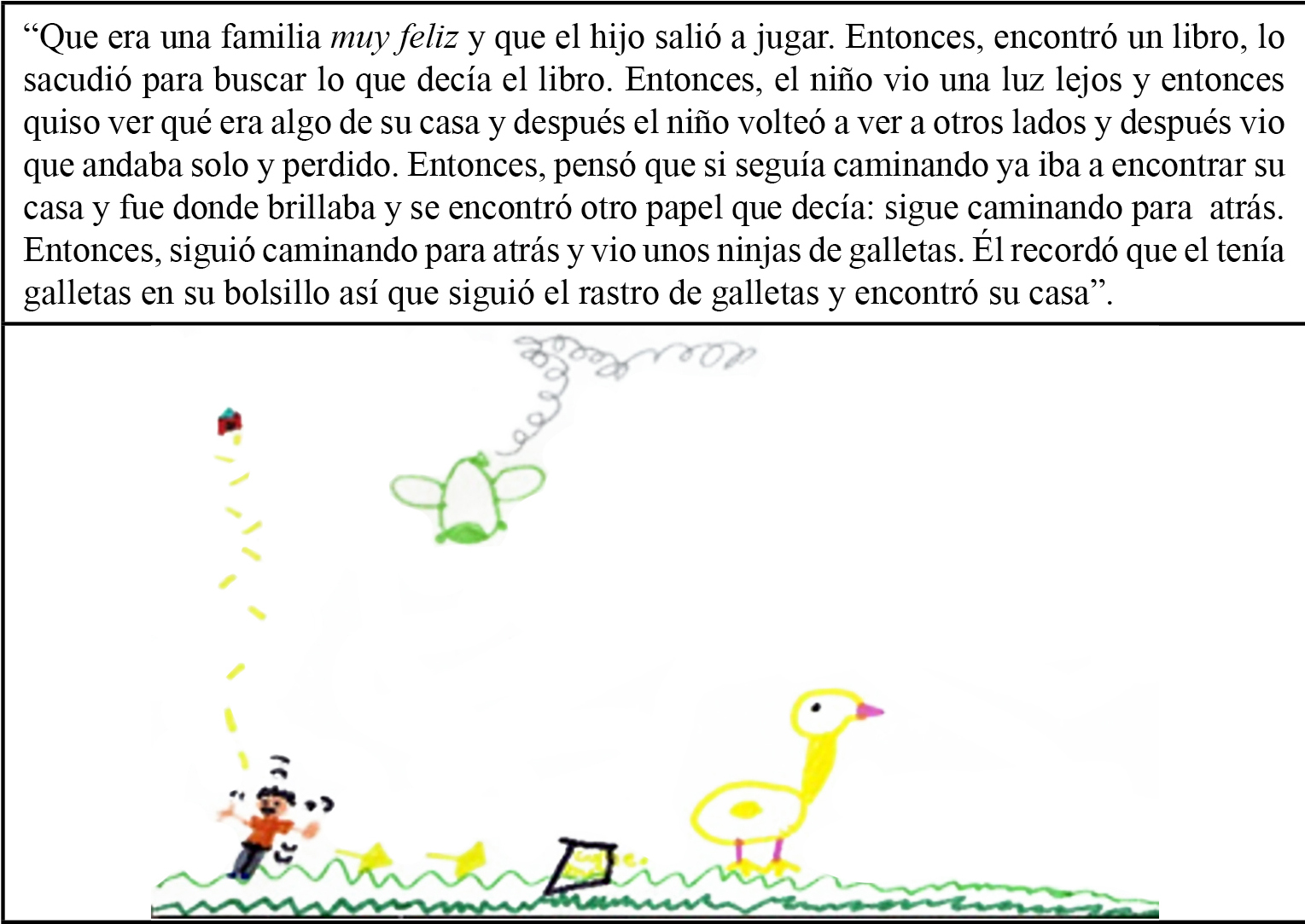Los niños que no lograron hacer narraciones de primer y segundo grado (37% en el nivel materializado, 47% en el nivel perceptivo y 32% en el nivel verbal) hablaron de experiencias en las que han participado y enumeraron situaciones. Ellos con frecuencia expresaron ideas sobre lugares que han visitado con sus familias, actividades con sus amigos o familiares y situaciones sociales en las que han participado (fiestas de cumpleaños, visitar el parque, visitar en una excursión el acuario).