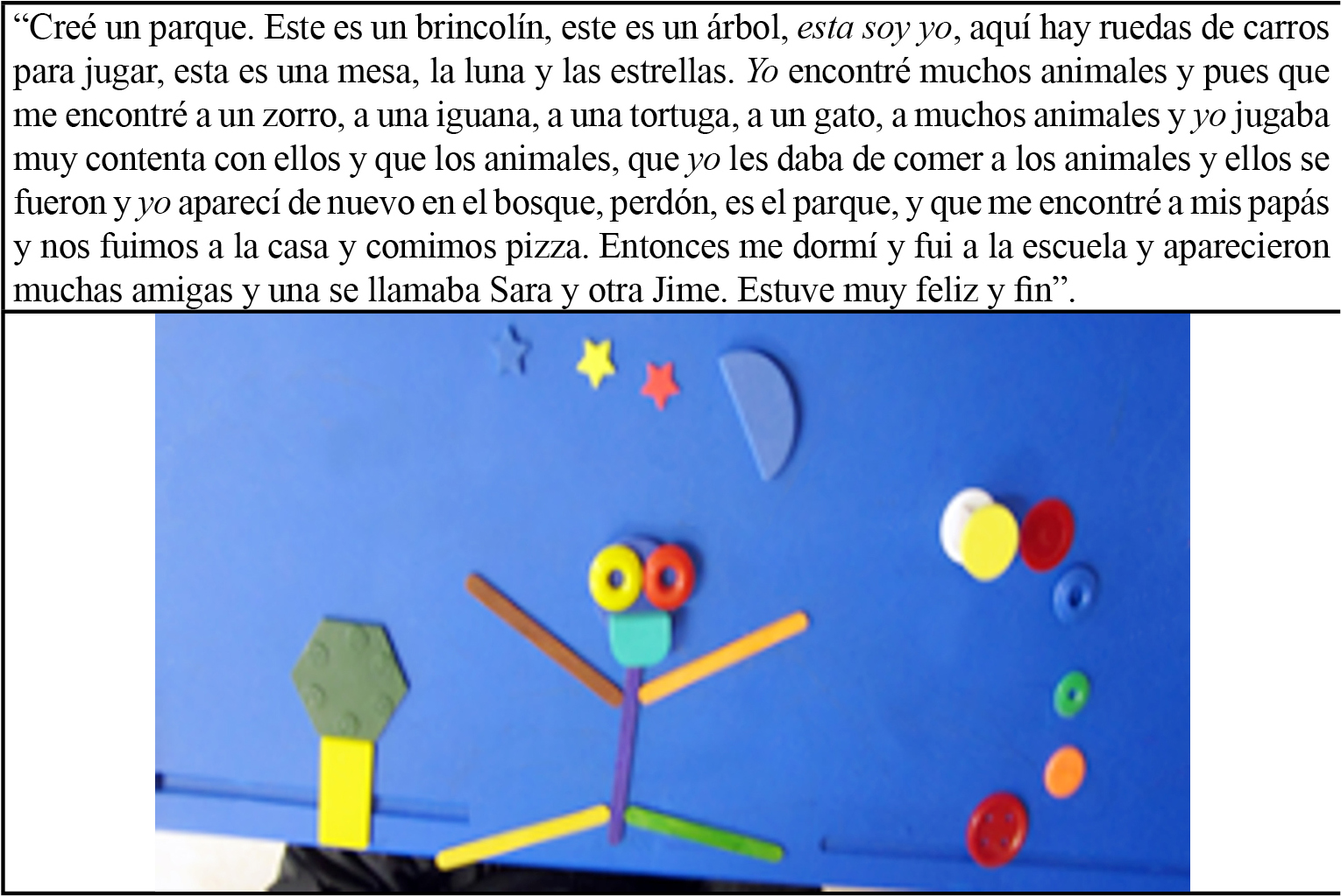 Otro hallazgo encontrado se dirige a la presencia de la actividad voluntaria positiva en los niños participantes del estudio, lo cual permitió la propuesta novedosa de la resolución de diversas situaciones que se les plantearon considerando el objetivo. Esto significa que los niños imaginaron lo que querían hacer con las figuras (lugar de diversiones, creación de objeto para ayudar a un niño perdido en el bosque a regresar a casa con sus papás), elaboraron una propuesta basada en sus ideas, jugaron con sus creaciones usando el lenguaje y compartieron sus ideas con el adulto a manera de explicación o narración. Se hipotetiza que estas respuestas emergieron porque estos niños han participado en amplias y enriquecidas actividades pedagógicas y didácticas de lectura compartida de literatura infantil y de juego temático de roles sociales previamente (Solovieva, 2016). Además, en el colegio se utiliza la metodología interactiva y formativa en todas las asignaturas escolares de acuerdo con los planteamientos de la teoría de la actividad (Solovieva, 2019; Talizina, 2019; Solovieva y Quintanar-Rojas, 2019; Quintanar-Rojas y Solovieva, 2020).