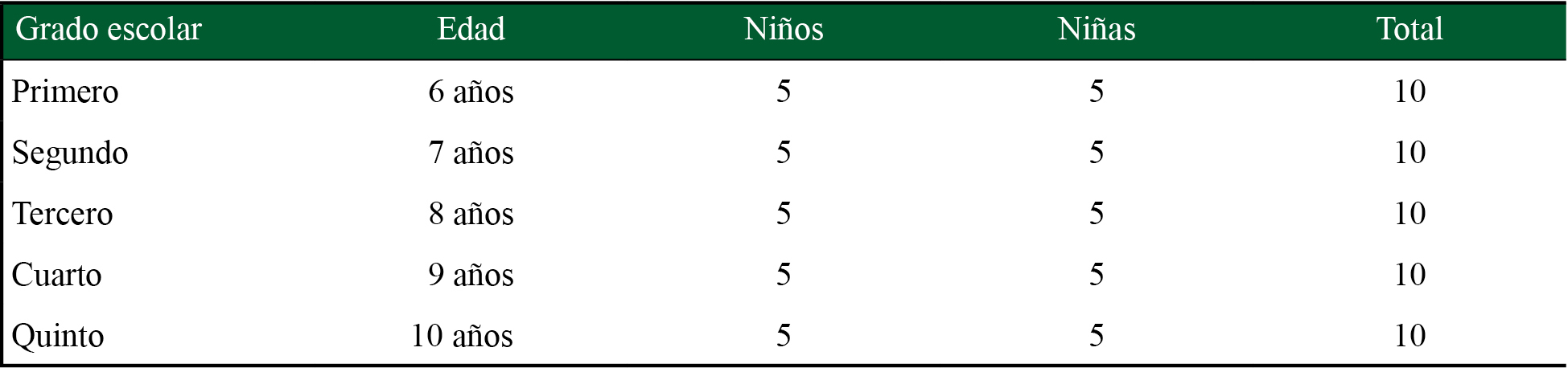 En el estudio participaron cincuenta niños en edad escolar, así como se muestra en el cuadro 1. Los criterios de inclusión fueron los siguientes: a) tener desempeño escolar regular y b) no contar con antecedentes neurológicos o psiquiátricos. Los niños evaluados provienen de una escuela privada de la ciudad de Puebla, México, que organiza la enseñanza de forma innovadora desde el enfoque histórico-cultural y la teoría de la actividad (Quintanar-Rojas y Solovieva, 2020). La metodología de enseñanza en este colegio se basa en aplicación de la zona del desarrollo próximo. El maestro guía a los niños para que participen en actividades grupales enfocadas a la adquisición de conceptos científicos, lectura compartida de literatura infantil y análisis reflexivo de la información de los textos en todas las asignaturas (Solovieva, 2019; Quintanar-Rojas y Solovieva, 2020).