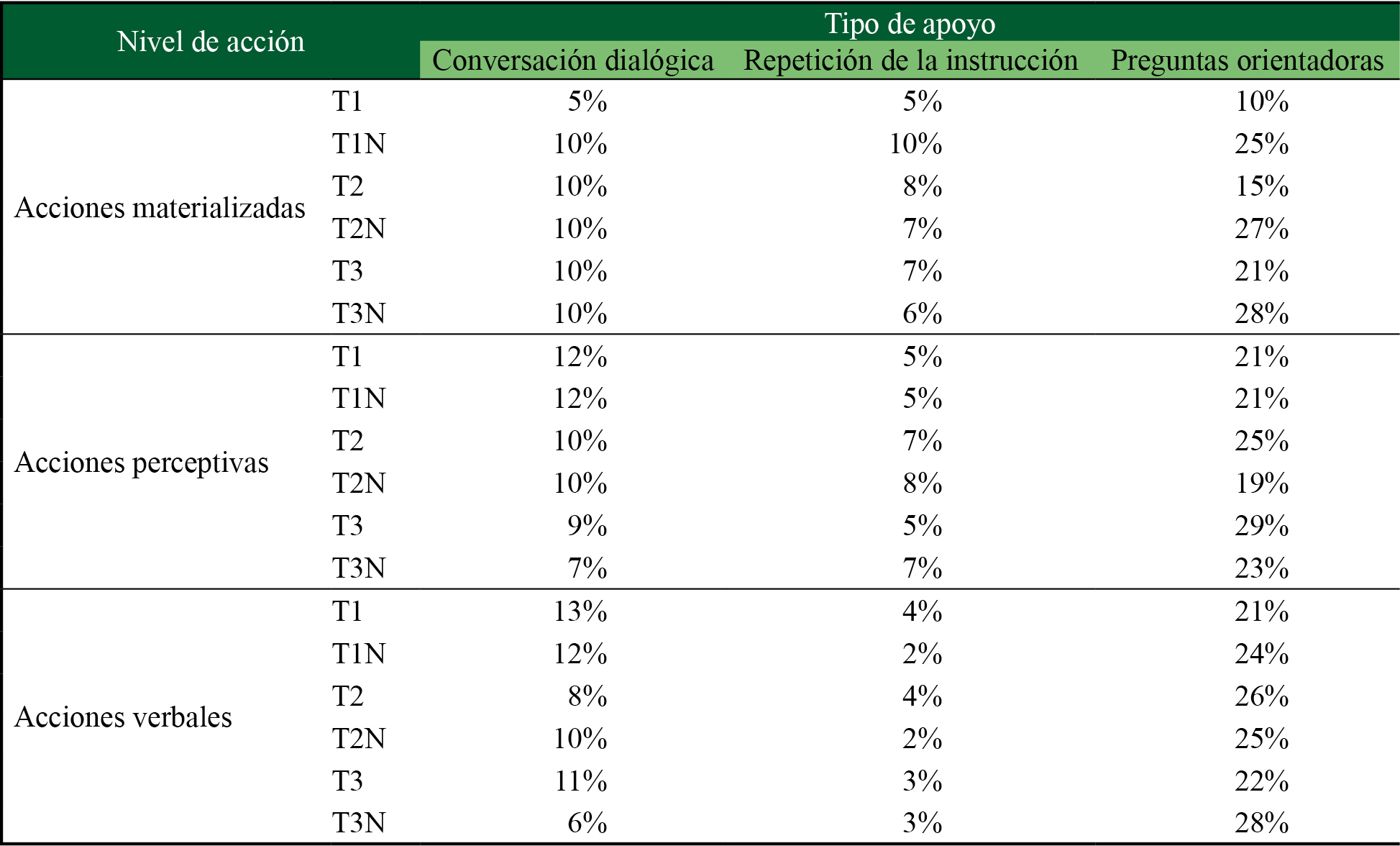 El análisis cualitativo se basó en la identificación de puntuaciones: a) sin apoyo (el niño realiza la tarea de manera independiente), b) con apoyo (el niño requiere de la conversación dialógica, de la repetición de la instrucción o de preguntas de orientación), c) no accede (el niño no logra completar la tarea que se propone). En el cuadro 2 se presentan los porcentajes de las diferentes tareas de la evaluación por tipo de acción (materializada, perceptiva y verbal). Estas tres indicaciones se aplican a la posibilidad de ejecutar las tareas propuestas en el nivel materializado, perceptivo y verbal.