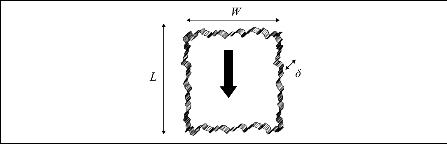 Para obtener el modelo se establecen las siguientes consideraciones: a) la fractura se visualiza como un sistema de placas paralelas irregulares, en las cuales su separación δ es significativamente mayor que la distancia W entre los puntos extremos (figura 1); b) la abertura de la fractura, identificada como la distancia δ entre las placas, es constante; es decir, su valor se determina mediante los conceptos clásicos de la geometría euclidiana; c) el contorno irregular de las paredes de la abertura se caracteriza a través de la dimensión fractal, siendo el ancho real W0 de la abertura mayor que la longitud lineal W entre los puntos extremos; d) en el interior del medio el flujo se mueve a través de un canal de morfología irregular de tal manera que la longitud L0 que recorre el fluido es mayor que la longitud lineal L entre los puntos extremos de la longitud de la fractura; e) el régimen de flujo es laminar, por lo que se considera un flujo bifásico en el cual se establecen tres patrones de flujo fundamentales: estratificado, anular con perfil no simétrico de la velocidad y anular con perfil simétrico tal y como se muestra en la figura 2; f) los fluidos son newtonianos e incompresibles; g) la fractura es horizontal y por ello los efectos gravitatorios pueden ser despreciados; h) el sistema se encuentra en estado estacionario.