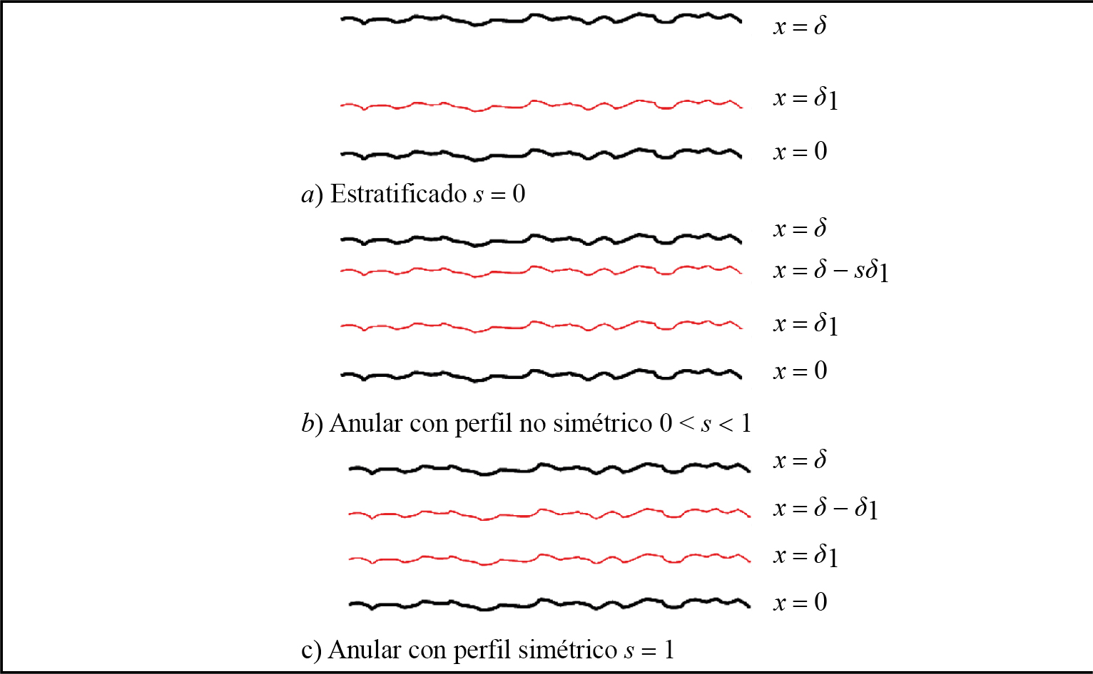 donde es el operador que representa la derivada fraccional de orden igual a la dimensión fractal β del contorno longitudinal al flujo y que se relaciona con la morfología del poro (Herrera-Hernández et al., 2019; Suárez-Domínguez et al., 2020). s es un parámetro que se identifica con el grado de simetría del perfil de velocidad y su valor se encuentra entre 0 y 1. Para s = 1 se tiene un flujo anular simétrico, para s = 0 se tiene un flujo bifásico estratificado y los restantes valores caracterizan un flujo anular con un perfil no simétrico de la velocidad. Nótese en este caso que si se establece δ = δ1, s forzosamente tiene que ser igual a 0 y se tiene el caso de un sistema monofásico a través del cual se transporta el fluido 1, que es el que se encuentra en contacto con la pared de la fractura que se toma como referencia para establecer las posiciones de las interfases.