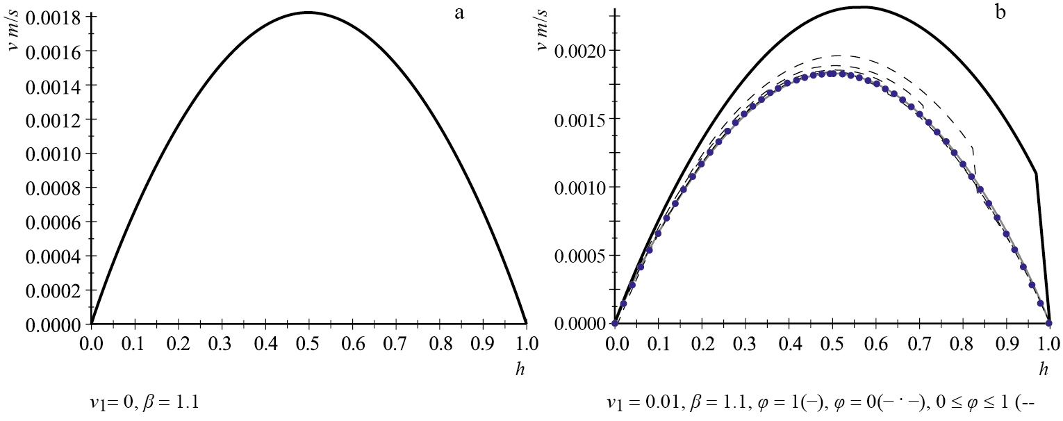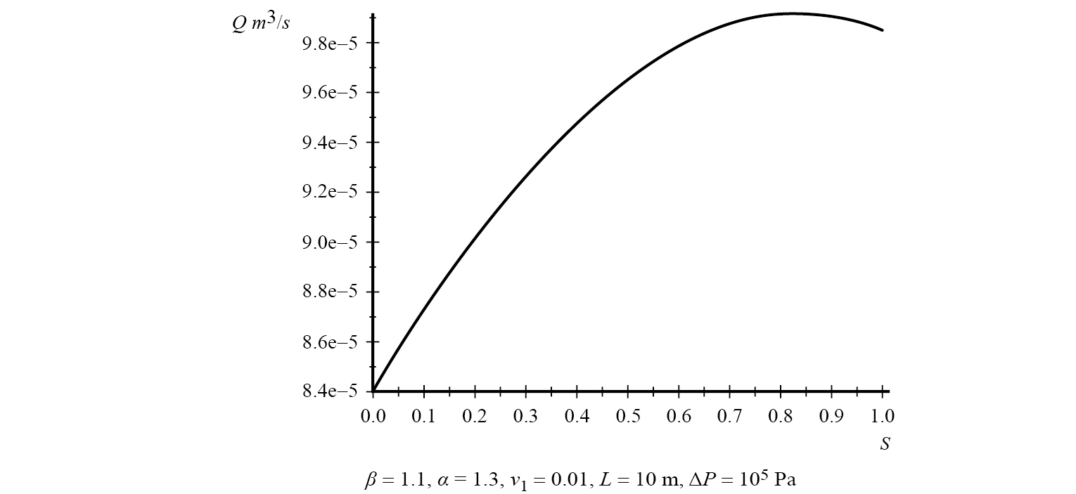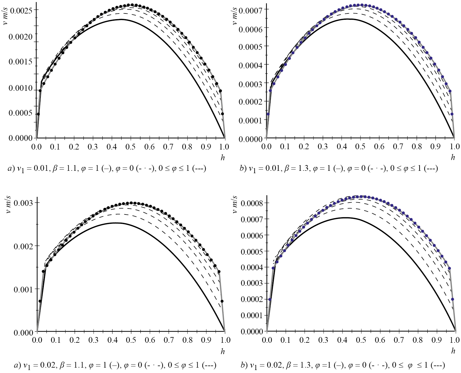 Por otra parte, nótese que la velocidad se incrementa además con la fracción en volumen del fluido menos viscoso, que es un resultado esperado, y con la disminución de la dimensión fractal longitudinal β. Este último aspecto es debido a que se ha considerado igual diferencia de presión, de modo que el aumento de la dimensión fractal implica un incremento en la longitud total L0 que debe recorrer el fluido con el consiguiente aumento de las pérdidas por fricción.