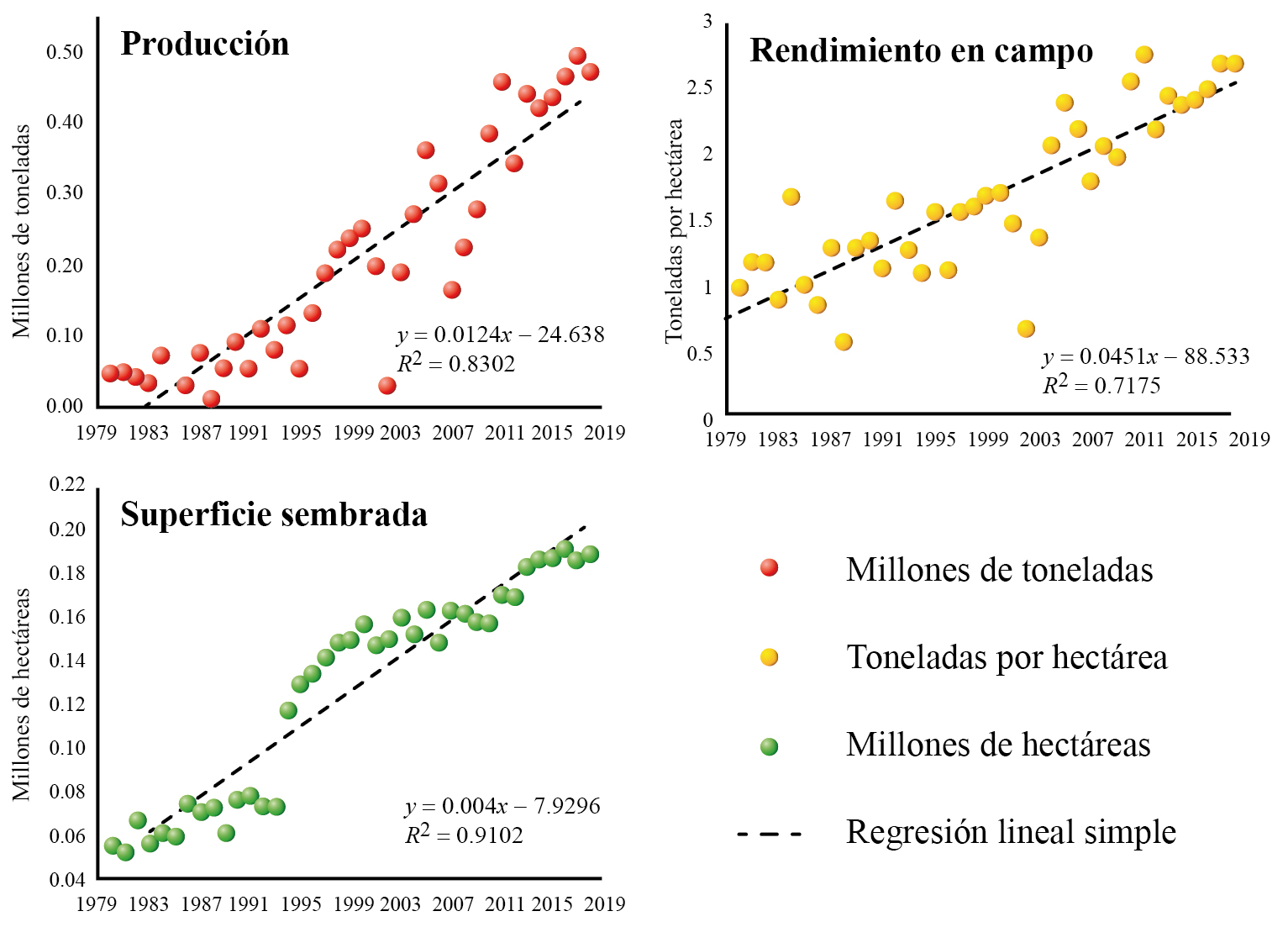 Del SIAP (2018b) se obtuvieron las variables: superficie sembrada (ha), superficie cosechada (ha), superficie siniestrada (ha), producción (t) y rendimiento en campo (t ha-1) por estado y por municipio de 1980 a 2018. Para determinar cómo evoluciona la producción de maíz grano a nivel estatal se ajustaron modelos temporales de regresión lineal simple a las variables superficie sembrada, rendimiento en campo y producción de 1980 a 2018 (Gujarati, 2007). Las diferencias en productividad por municipio de 2007 a 2018 fueron visibles con un análisis de varianza múltiple (MANOVA) y pruebas de medias por Tukey con un nivel de confiabilidad del 95%.