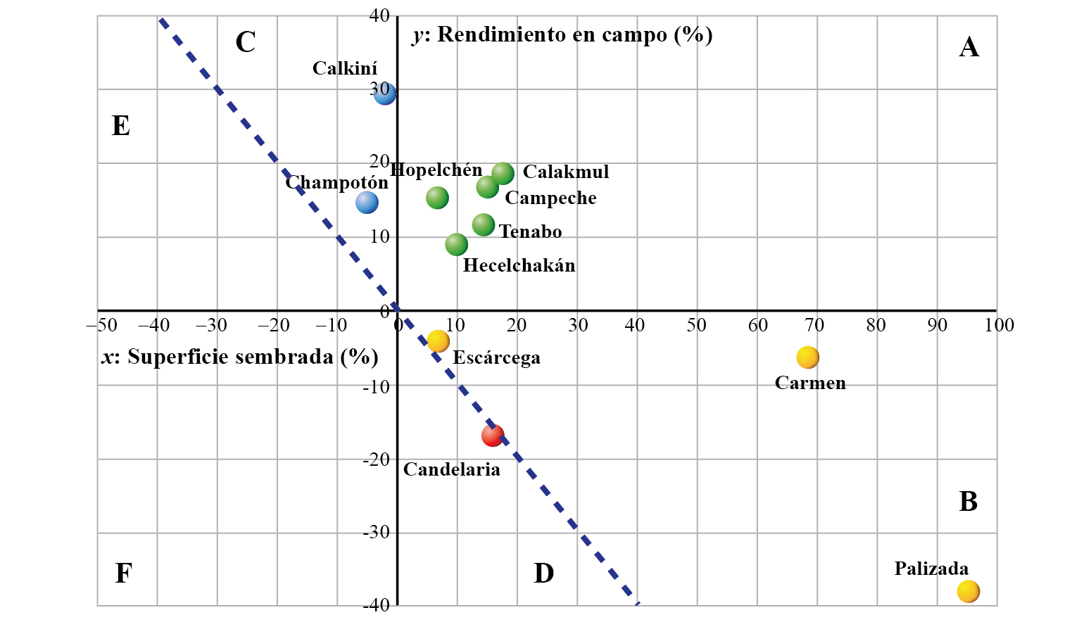 En la gráfica 2 se presenta una tipología a partir de los ejes de crecimiento en superficie sembrada y rendimientos en campo, incluye además una diagonal que ubica por encima a los municipios que tuvieron crecimiento en la producción y por debajo a los que presentaron una reducción para el periodo 2013-2018 respecto a 2007-2012. Se encontró que diez de los once municipios tuvieron un crecimiento, sólo el caso de Candelaria presentó un decrecimiento como consecuencia de una reducción en sus rendimientos de campo.
