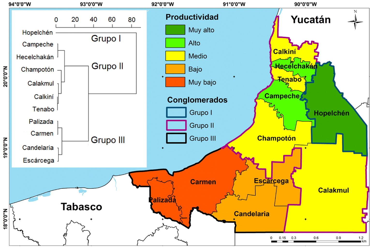 La técnica del análisis jerárquico por conglomerados también permite definir grados de diferencia entre los grupos, de tal forma que la diferencia entre el Grupo I y Grupo II es menor que la diferencia entre el Grupo I y Grupo III (Pardo y Del Campo, 2007). La diferenciación de los 3 grupos y su representación espacial permitió establecer que la mayor productividad de maíz grano en el estado de Campeche se concentra en la región norte (Grupo I) y centro-norte (Grupo II). La productividad más baja se localiza en el sur del estado (Grupo III).