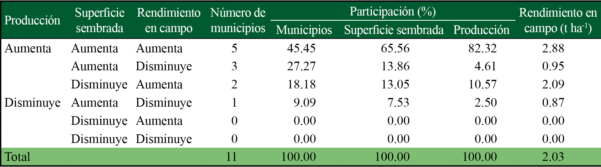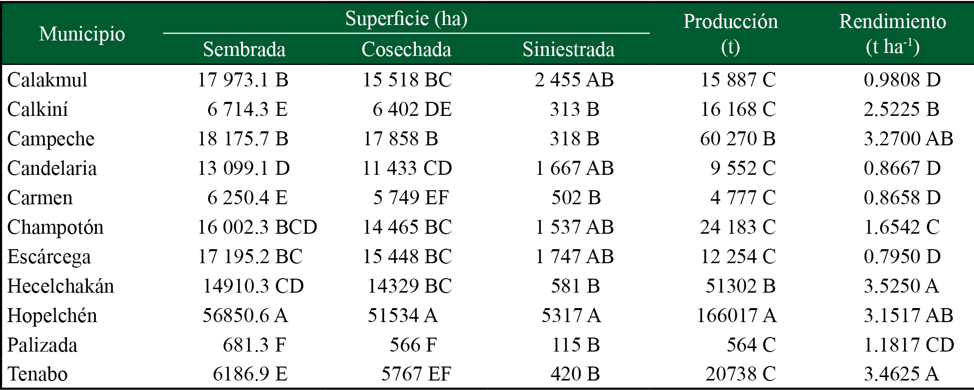 Por el modelo de descomposición de factores del crecimiento de la producción (Gómez, 1994), se encontró que en 2013-2018 la productividad de maíz grano en el estado de Campeche tuvo un crecimiento del 23% respecto a 2007-2012, como respuesta a un incremento del 11.3% de las superficies sembradas, y un aumento en la eficiencia de los rendimientos en campo del 10.2%. El 90.91% de los municipios en el estado (10 de 11) incrementaron su productividad. El 82.32% de la producción estatal se concentró en cinco municipios que contienen el 65.56% de la superficie sembrada con rendimientos superiores a las 2.5 t ha-1 (cuadro 2).
