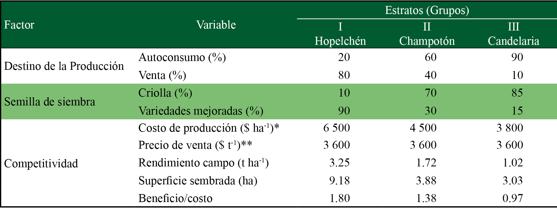 En el cuadro 3 se observan los indicadores de productividad de maíz grano de un grupo de transición de productores (Grupo II) con un nivel de competitividad intermedio (1.38) que coincide con la región centro-norte del estado. La mayor diferencia en competitividad se presentó entre el norte del estado (Grupo I: Hopelchén) y sur (Grupo III: Candelaria). De acuerdo con Aguilar et al. (2015), este aspecto es significativo porque si se requiere incrementar la competitividad en el estado, se debe trabajar primero con los grupos de transición y después con los grupos de menor competitividad y no intentar homogeneizar la competitividad al mismo tiempo, que es lo que ha hecho que las políticas públicas agrícolas en el estado de Campeche no hayan tenido los resultados esperados (Pat Fernández et al., 2011).