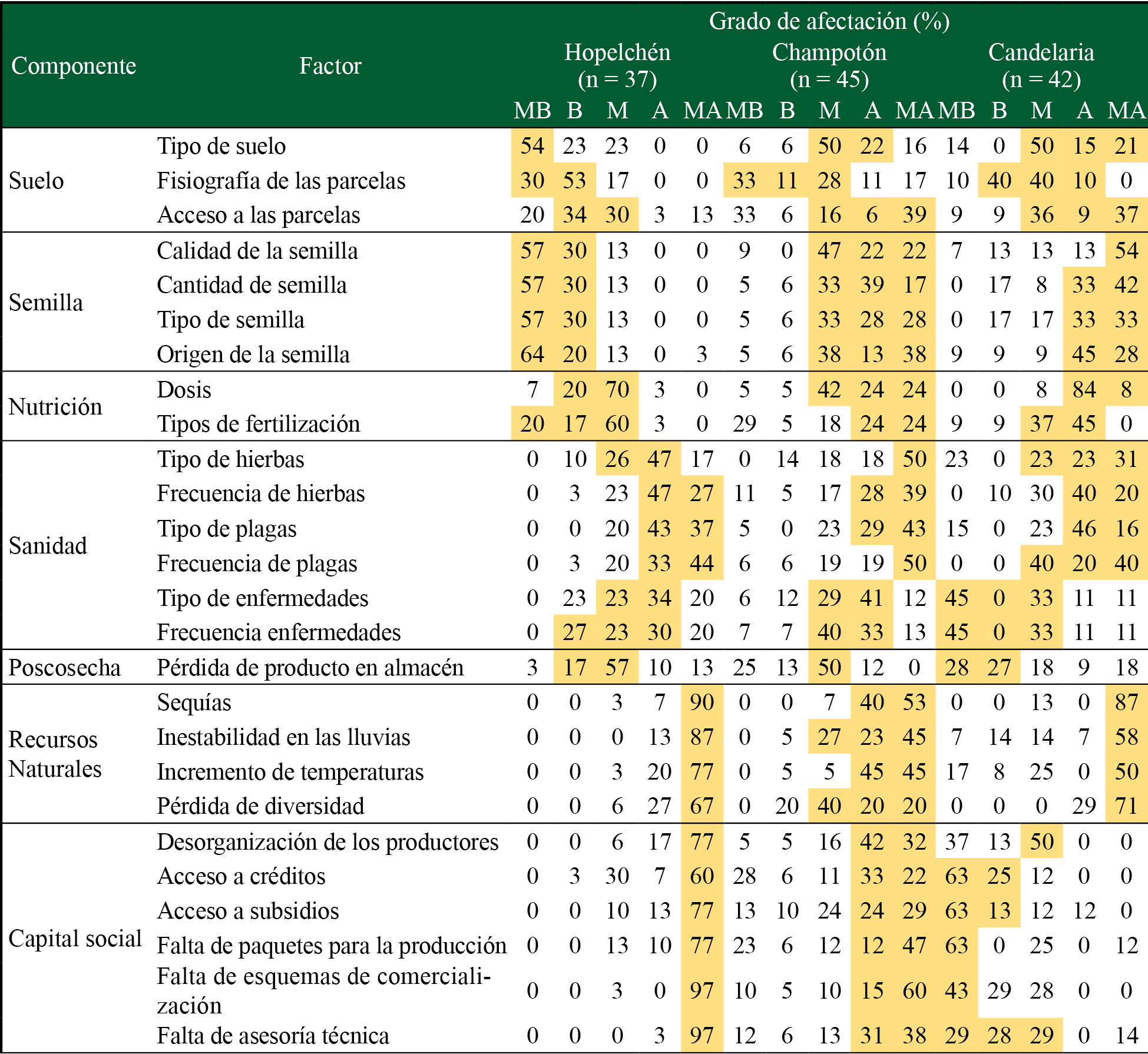 El manejo postcosecha en los tres municipios estudiados resultó con una incidencia en la productividad de medio a muy bajo. Este resultado contrasta con lo encontrado por Tucuch Cauich et al. (2007), quienes estimaron pérdidas entre el 40 y 60% de la producción por un manejo inadecuado de almacenamiento ante las altas temperaturas que se registran en el estado de Campeche. Sin embargo, Donnet et al. (2017) y Odjo et al. (2020) consideran que los programas de fortalecimiento al campo donde se capacita y apoya con infraestructura a los productores en temas relacionados con la poscosecha han logrado reducir las mermas.
