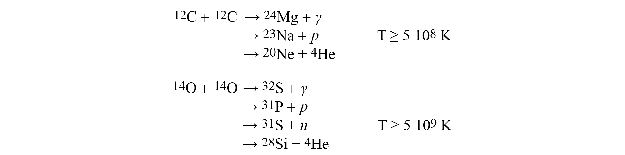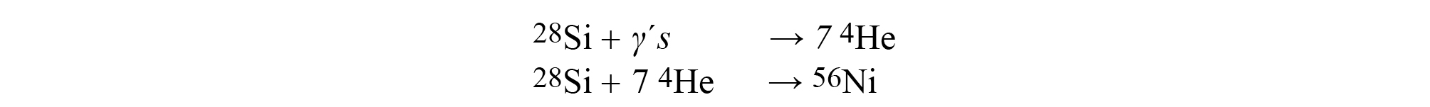 In case of Silicon burning, which begins at a temperature of 2 109 K, the reactions proceed slightly differently because the high energy gamma rays remove protons and 4He particles from the silicon nuclei and the heavier elements are thus synthetized by the addition of 4He nuclei through reactions which can be schematically written as: