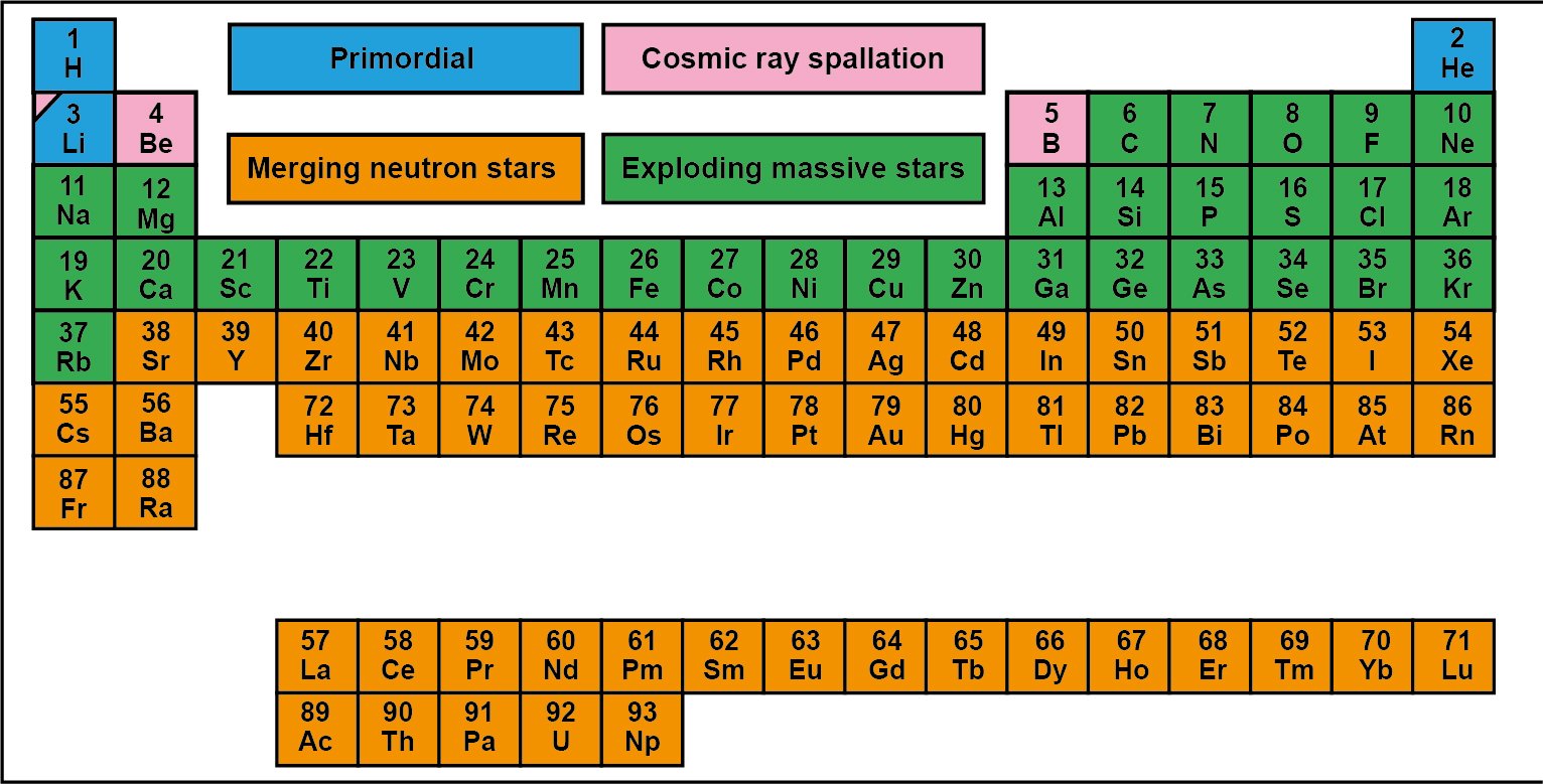 On 25 April 2019, gravitational waves from a second merger of two neutron stars were observed by the LIGO Livingston detector (Abbott et al., 2020). This second event took place about 500 million light-years away, which also confirms that neutron mergers in the past were not unusual, spreading heavy nuclei to the interstellar medium and thus explaining the presence of heavy metals in old UFD galaxies. Figure 8 shows how the periodic table of elements looked 200 million years after the Big Bang.