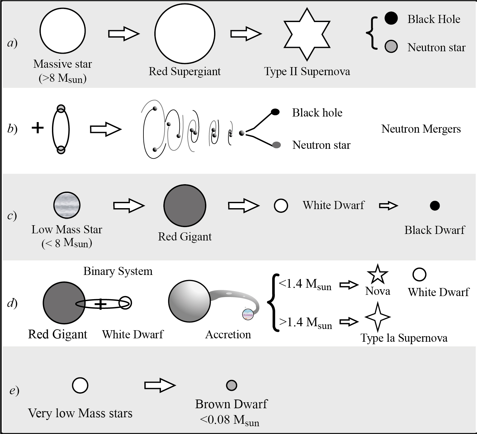 For very low mass stars whose final mass just before death is less than about 1.4 Msun (Chandrasekar limit), which is believed to be the case for most stars in the universe, their cores collapse (figure 9e). Then their cores continue to shrink until they reach a very high density becoming white dwarfs achieving equilibrium forming an electron degenerate gas. They can still radiate light. After many billions of years, white dwarfs will no longer radiate light and in the very far future they will then turn to be black dwarfs-cold stellar corpses with the mass of a star and the size of a planet composed mostly of carbon, oxygen, and neon. However, the time required for a white dwarf to reach this state is calculated to be longer than the current age of the universe (13.8 billion years), so no black dwarfs are expected to exist in the universe now (Heger et al., 2003).