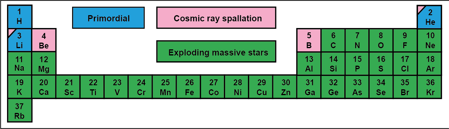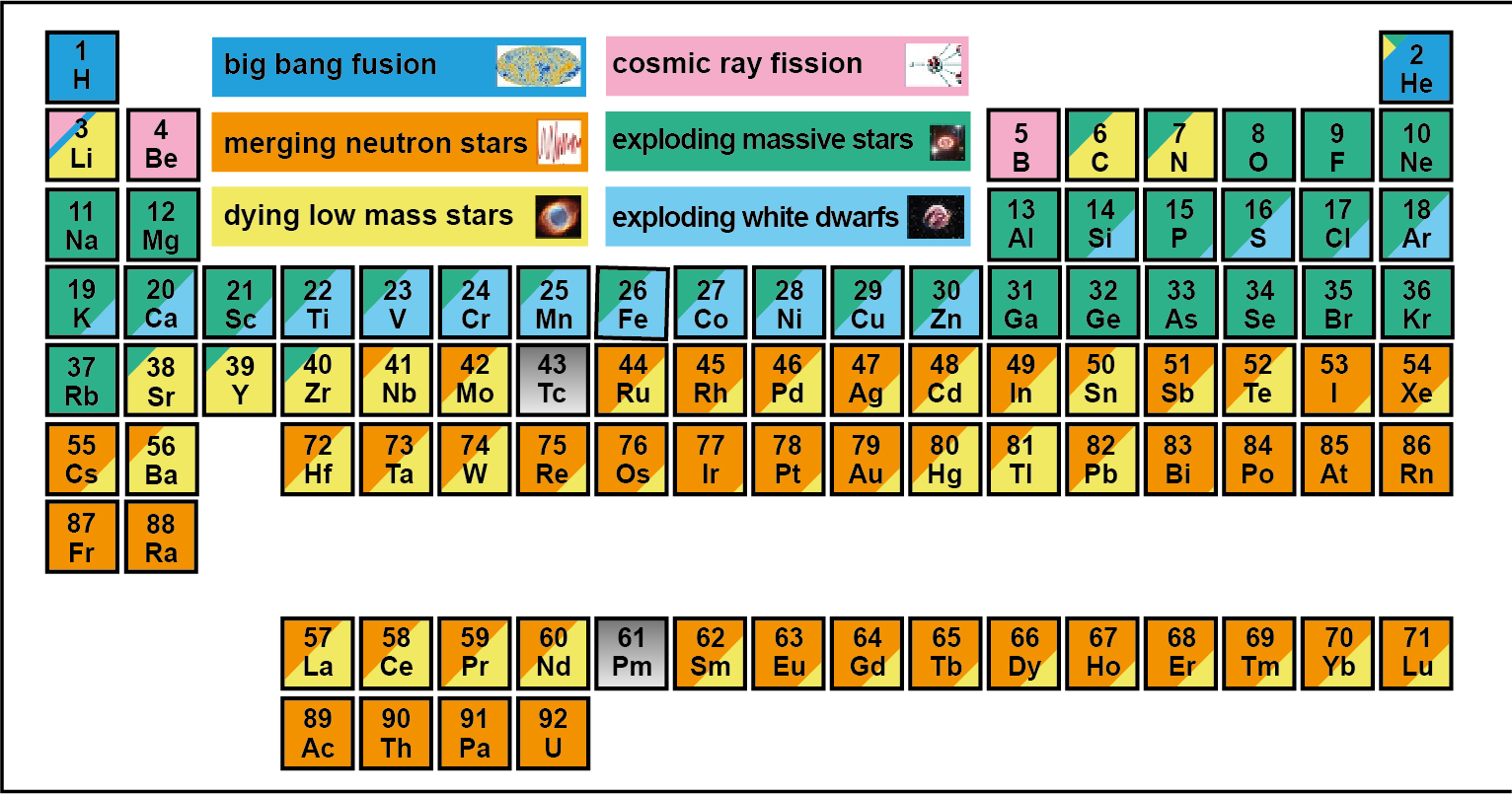 All the explosive processes that we have just described, in addition to the fission or rupture of already formed nuclei, rupture by very energetic cosmic rays (spallation), have been going on through eons of years. This has produced the abundance and distribution of chemical elements that we observe today. Finally, we show the current table of elements in figure 10.