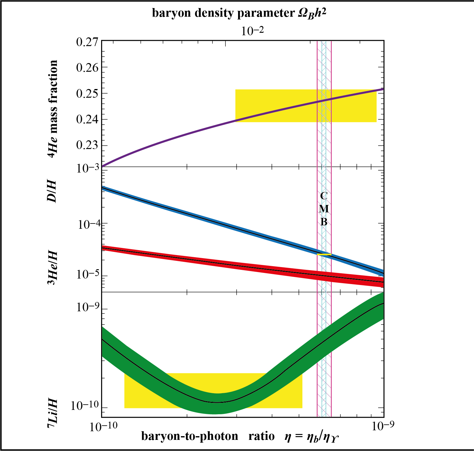 The light element abundances as predicted by the SBBN model (“Schramm Plot”) are shown in figure 3 compared to values obtained from WMAP (Wilkinson Microwave Anisotropy Probe) observations of the Cosmic Microwave Background (CMB).